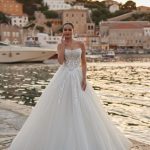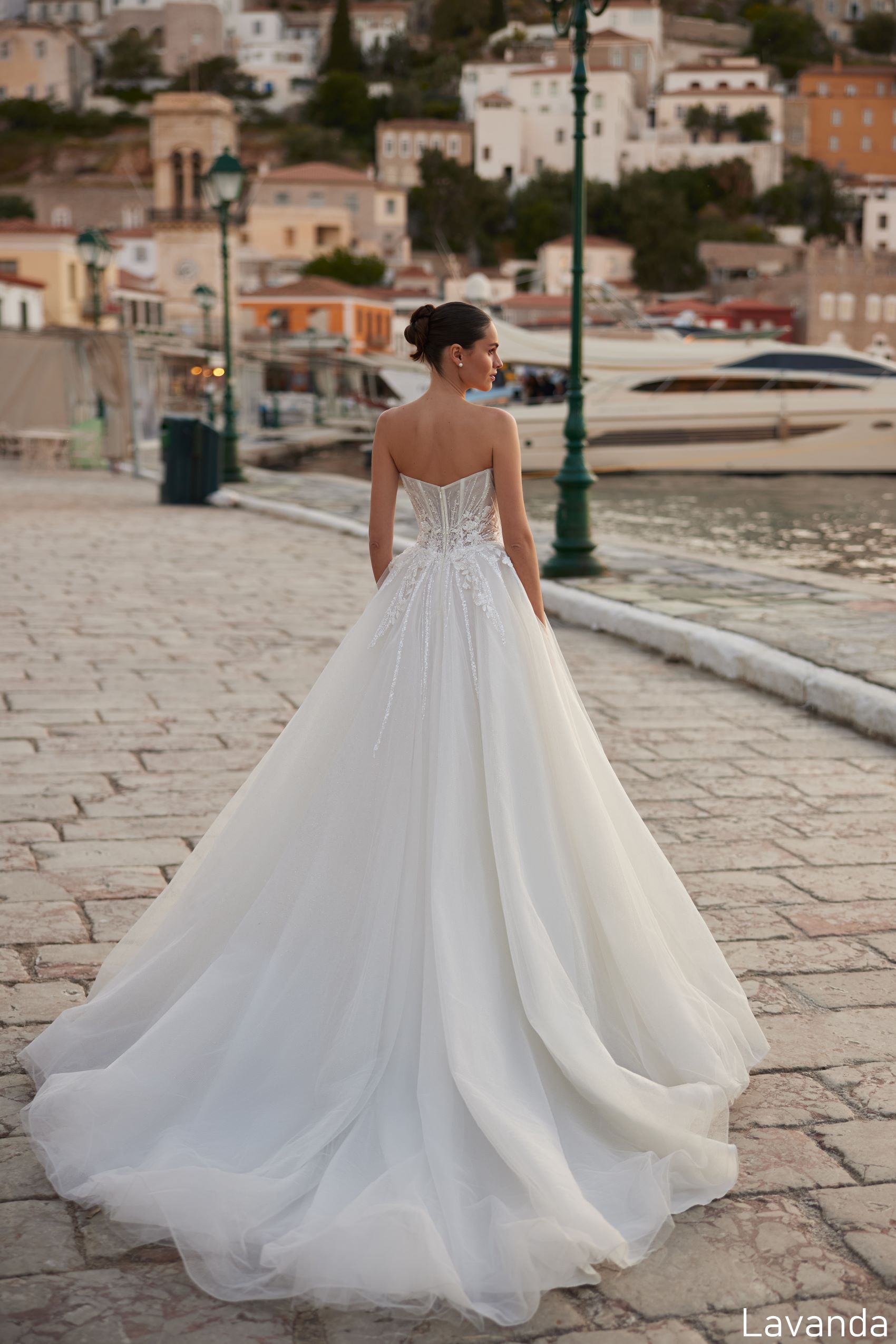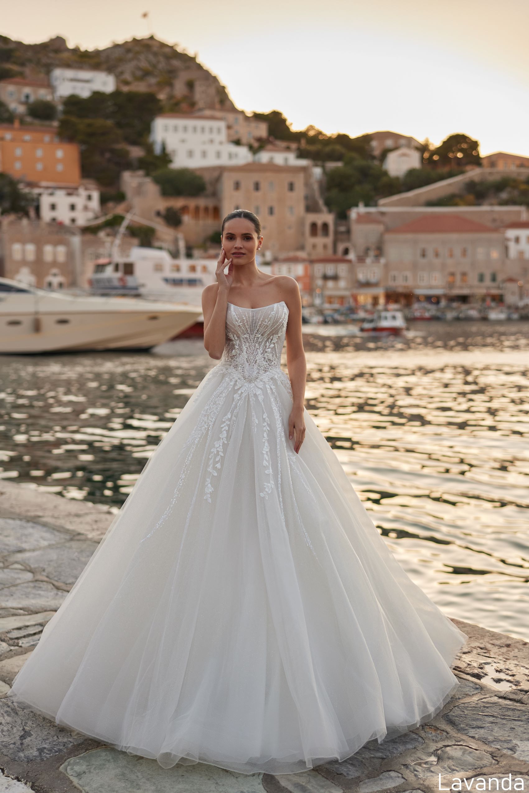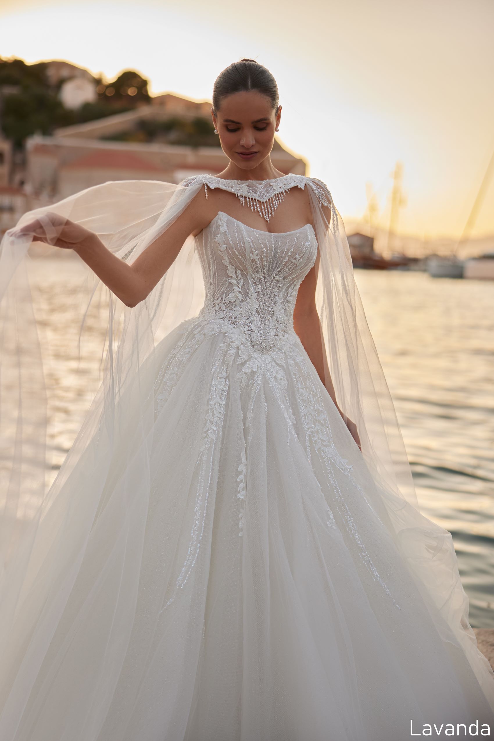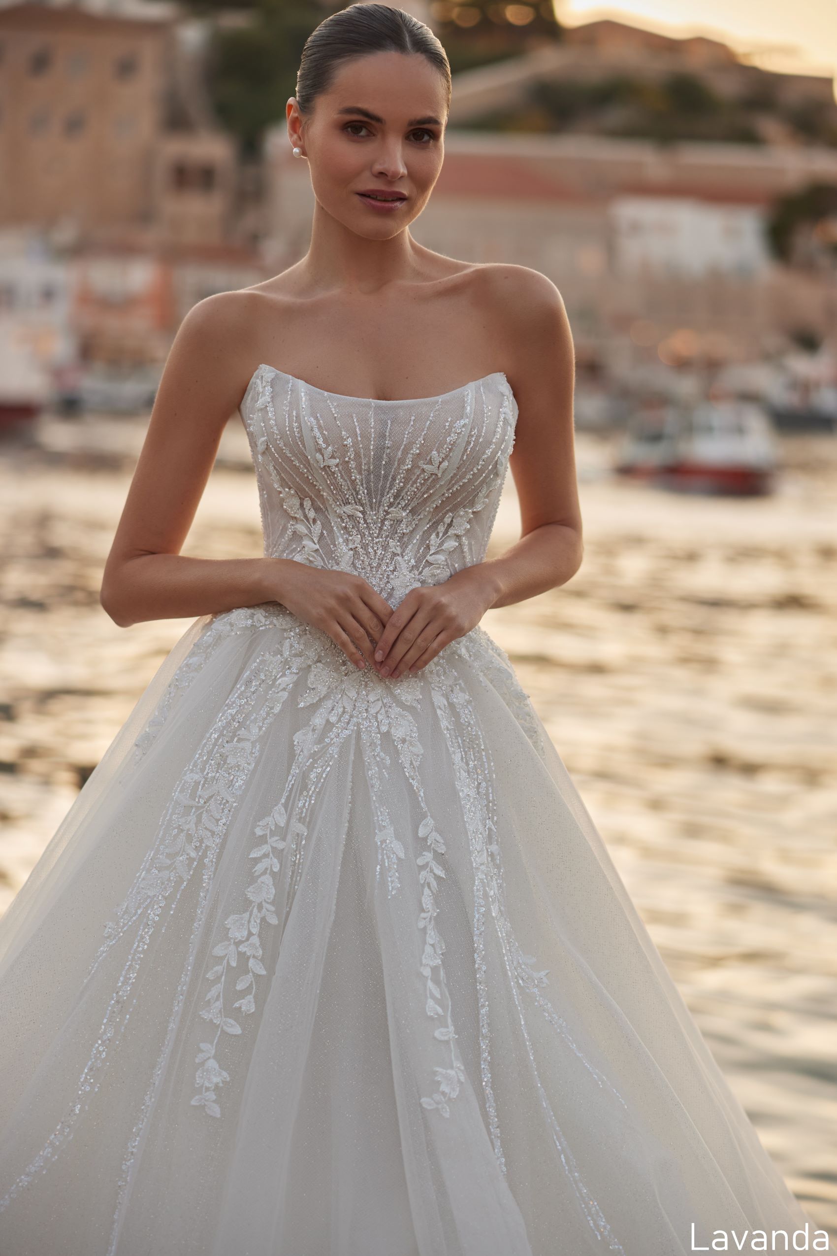 Lavanda este o rochie de mireasă princiară, creată pentru a impresiona. Bustul corset cu detalii brodate și aplicații florale evidențiază silueta, în timp ce fusta amplă din tulle fin adaugă volum și romantism.