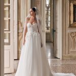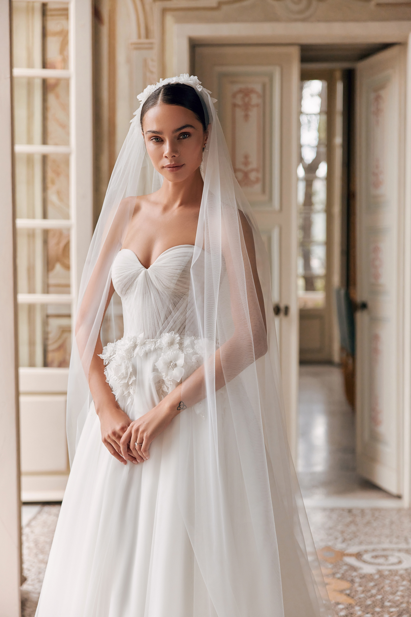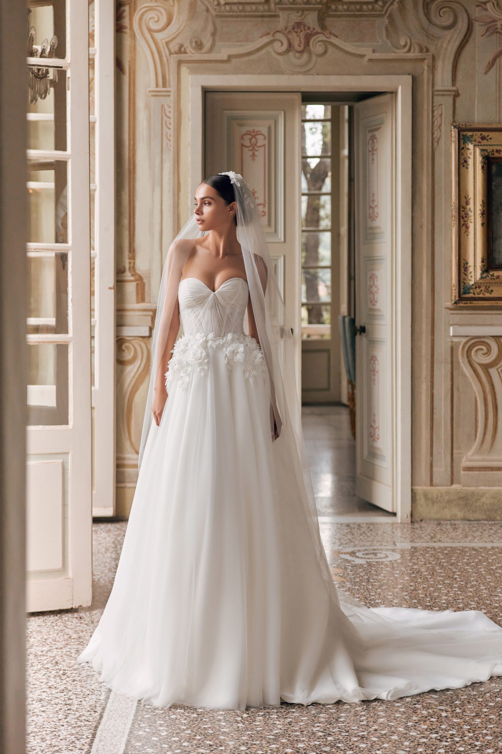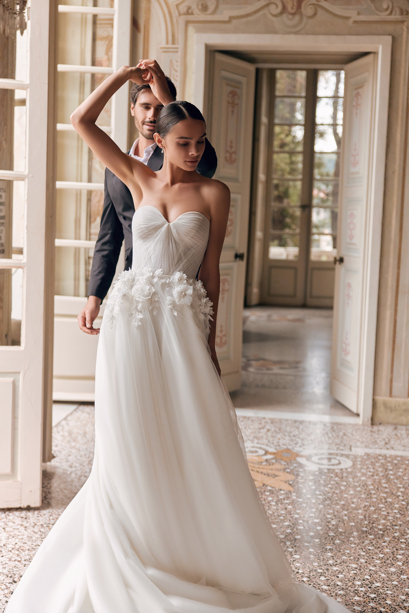 A delicate Asia sweetheart bustier dress with a lace-up back is designed for the most delicate looks. A multi-layered skirt made of soft mesh and an atypical draped corset draw graceful lines of the figure. The dress is embellished with voluminous handmade flower appliqués embroidered with pearls, beads, and bugles.