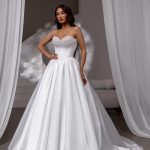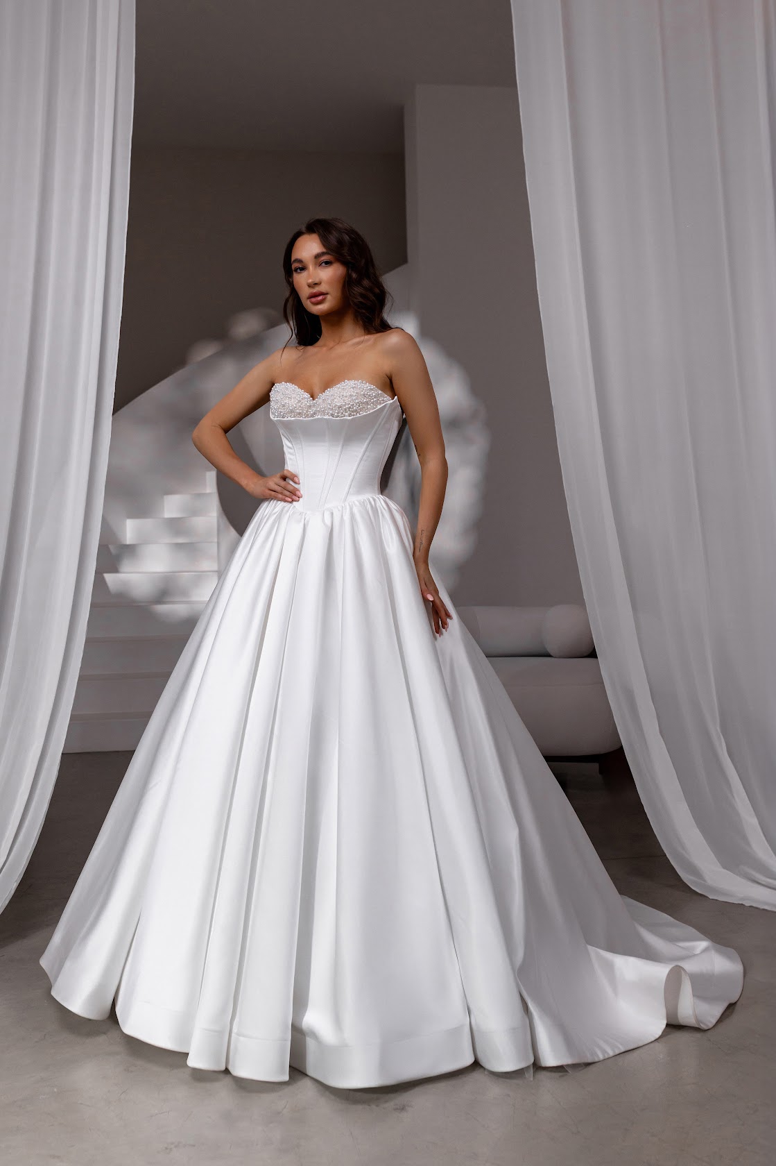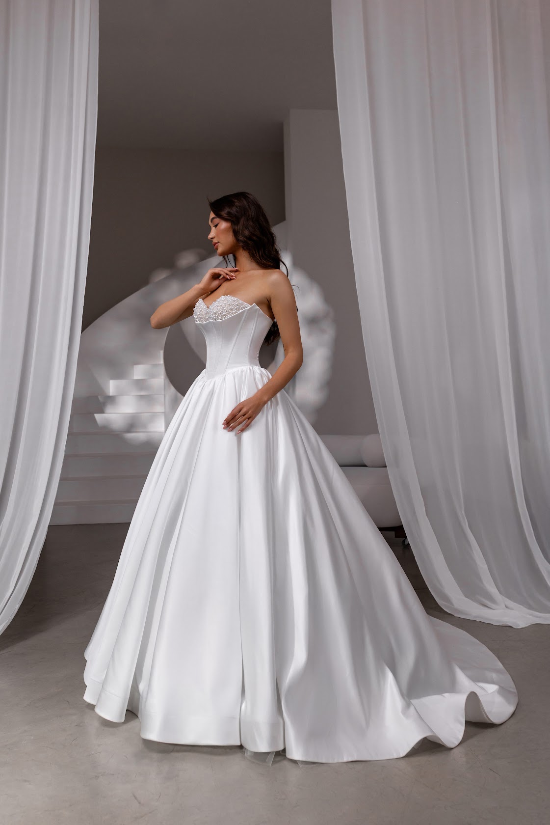 Rochia de mireasă Aurum este definiția eleganței sofisticate. Bustul tip corset, decorat cu perle fine aplicate manual, oferă un contrast splendid cu croiala structurată a corsetului și cu fusta amplă din tafta. Mânecile lungi, bufante și detașabile, adaugă un efect dramatic și regal, ideal pentru o apariție cu adevărat memorabilă.