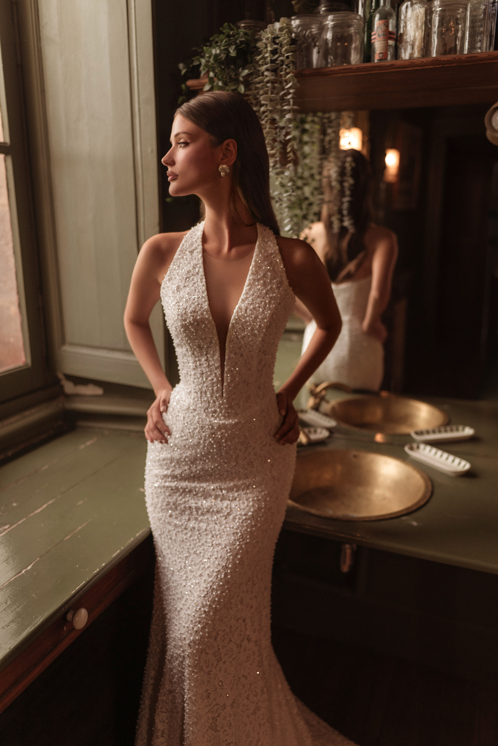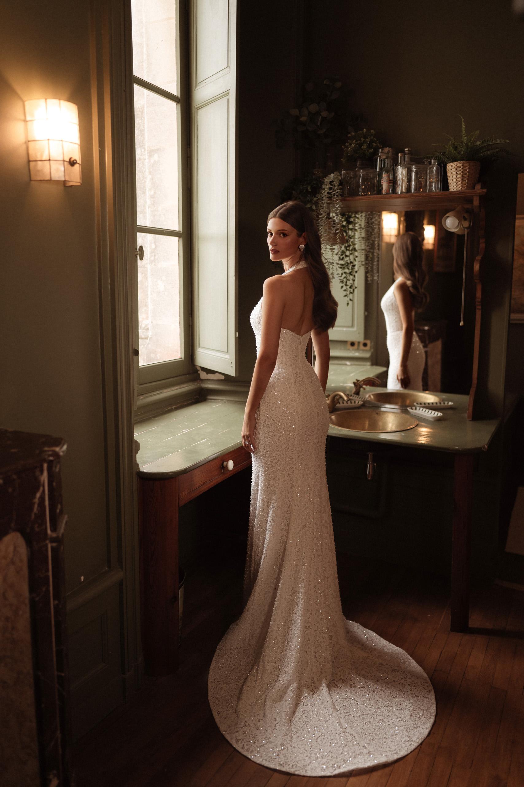 Decolteul adânc în V, cu prindere tip halter, subliniază linia gâtului și a umerilor, oferind o notă îndrăzneață și elegantă în același timp. Materialul bogat, împodobit cu aplicații delicate și accente strălucitoare, captează lumina la fiecare pas, în timp ce trena grațioasă adaugă dramatism și noblețe.