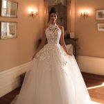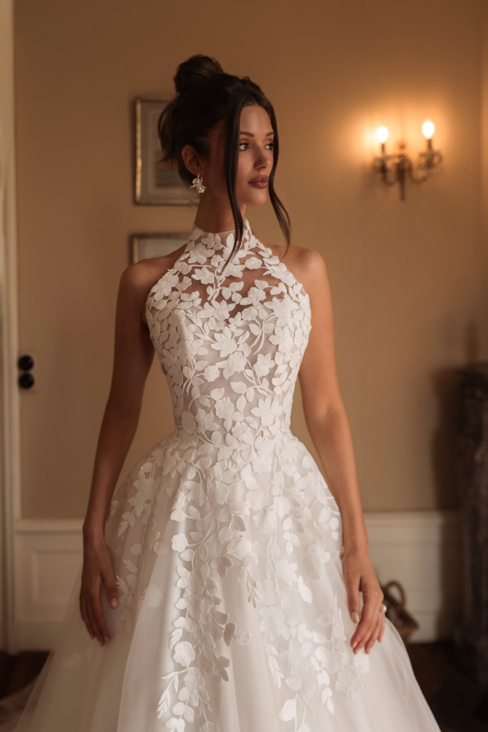 Rochia de mireasă Bridget este expresia perfectă a rafinamentului modern și a romantismului clasic. Cu un corset spectaculos, acoperit de aplicații florale 3D și un guler halter elegant, acest model atrage privirile prin unicitate și feminitate.