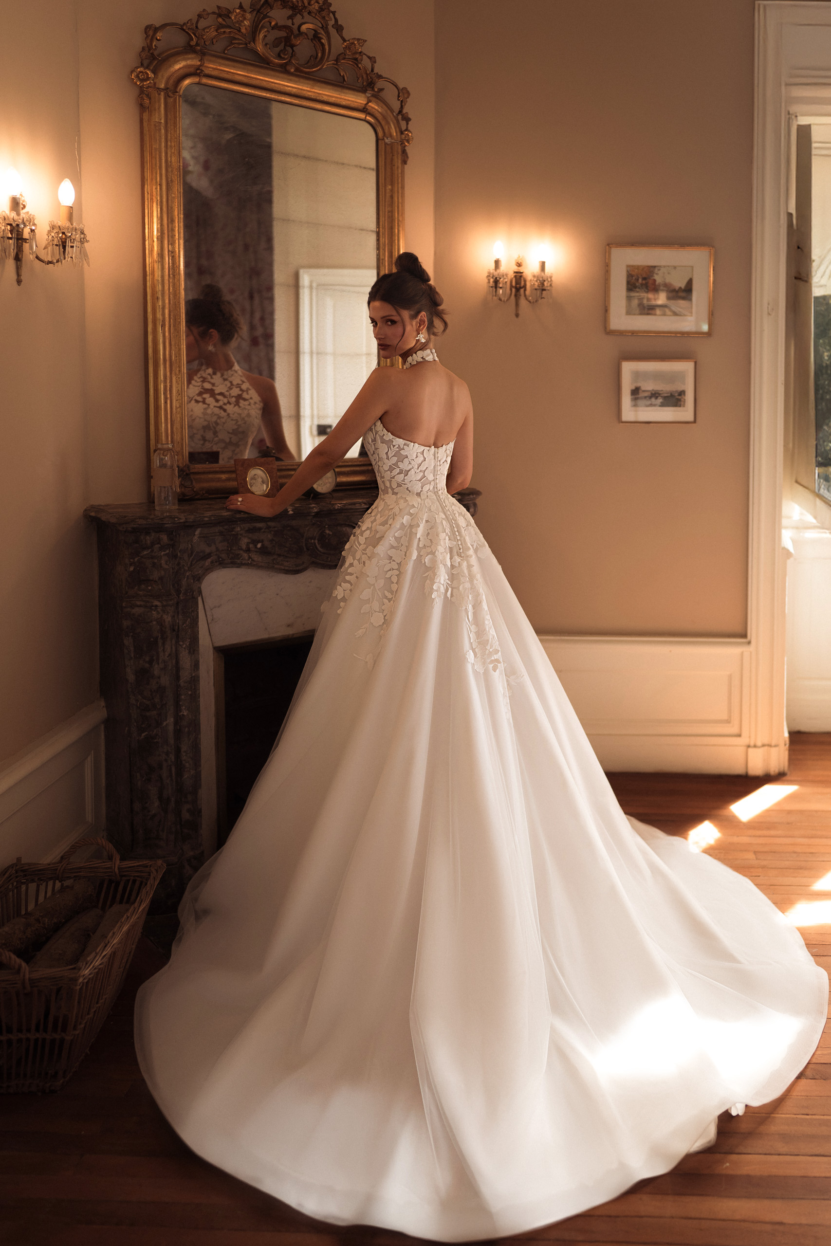 Decolteul halter subliniază linia gâtului și a umerilor, oferind un plus de eleganță și modernitate, în timp ce silueta tip prințesă face din Bridget alegerea ideală pentru miresele care își doresc o apariție regală, memorabilă și sofisticată.