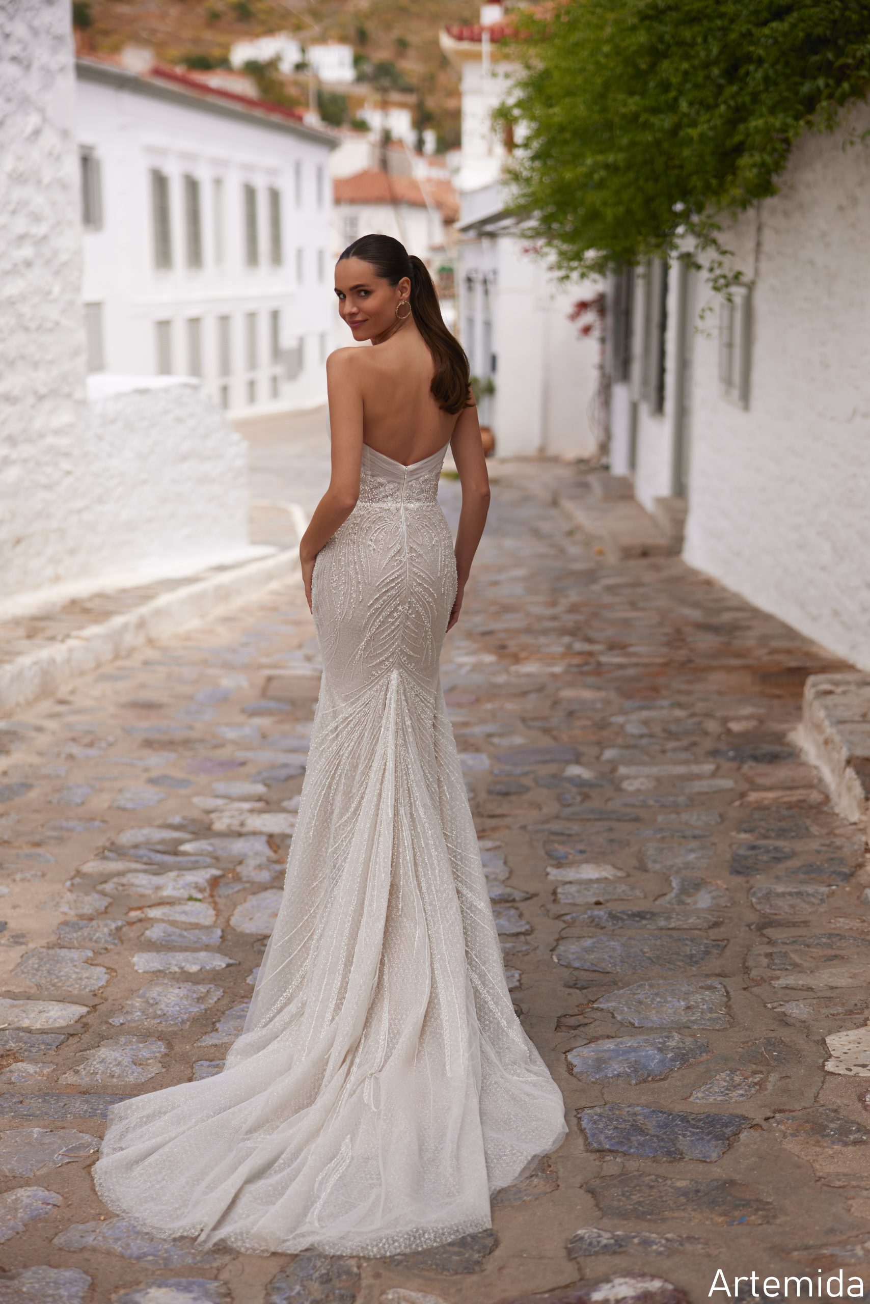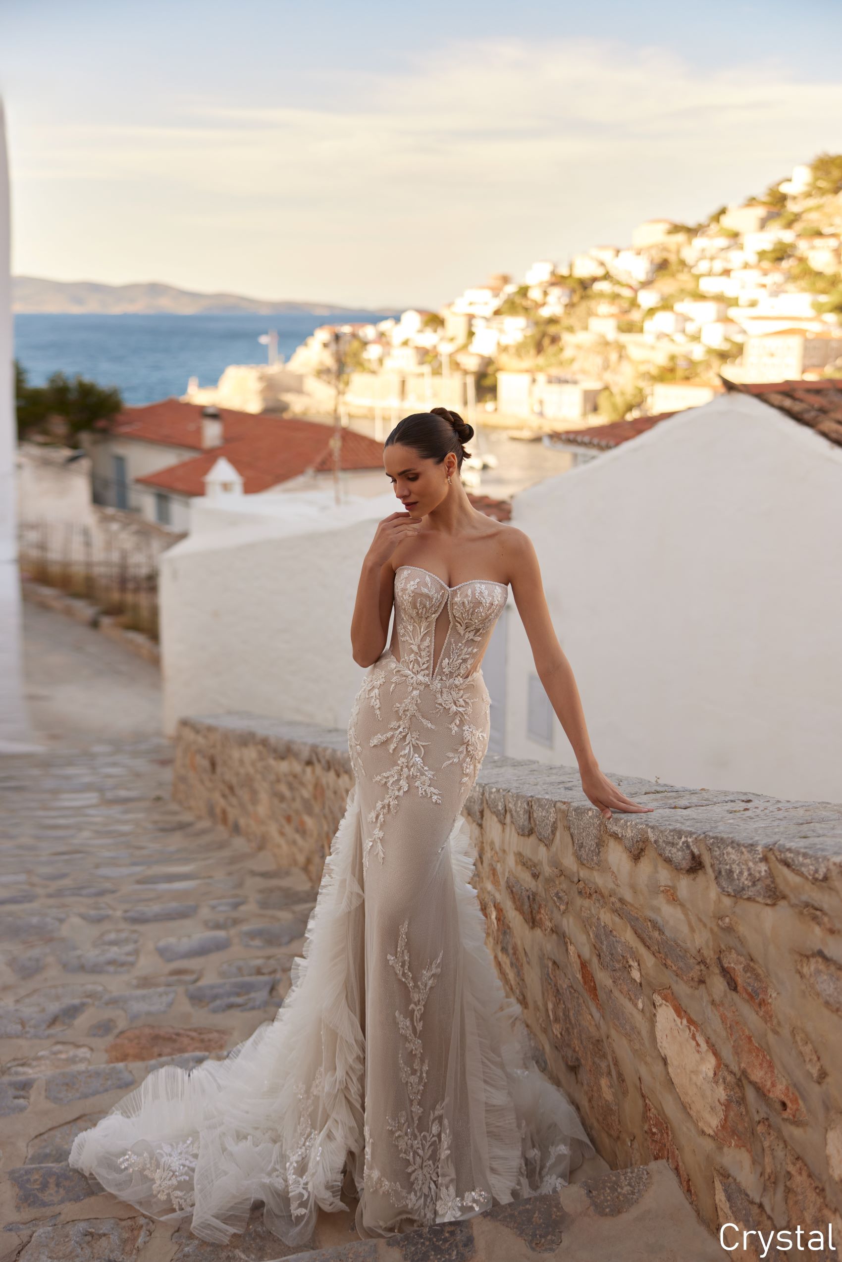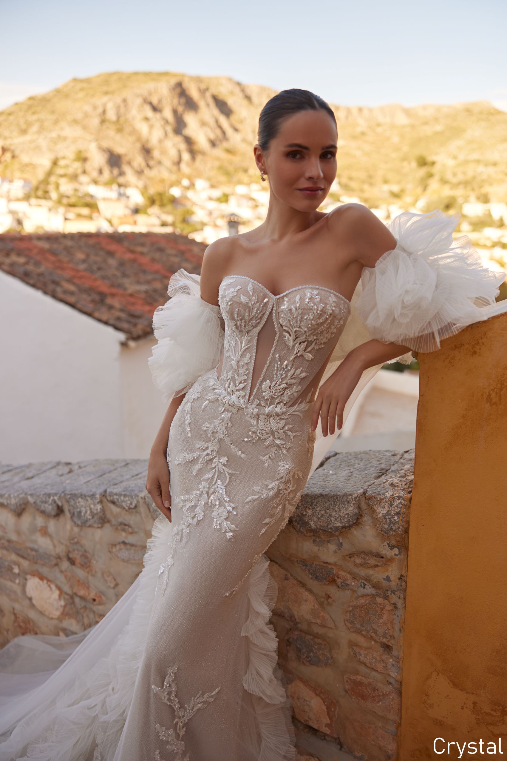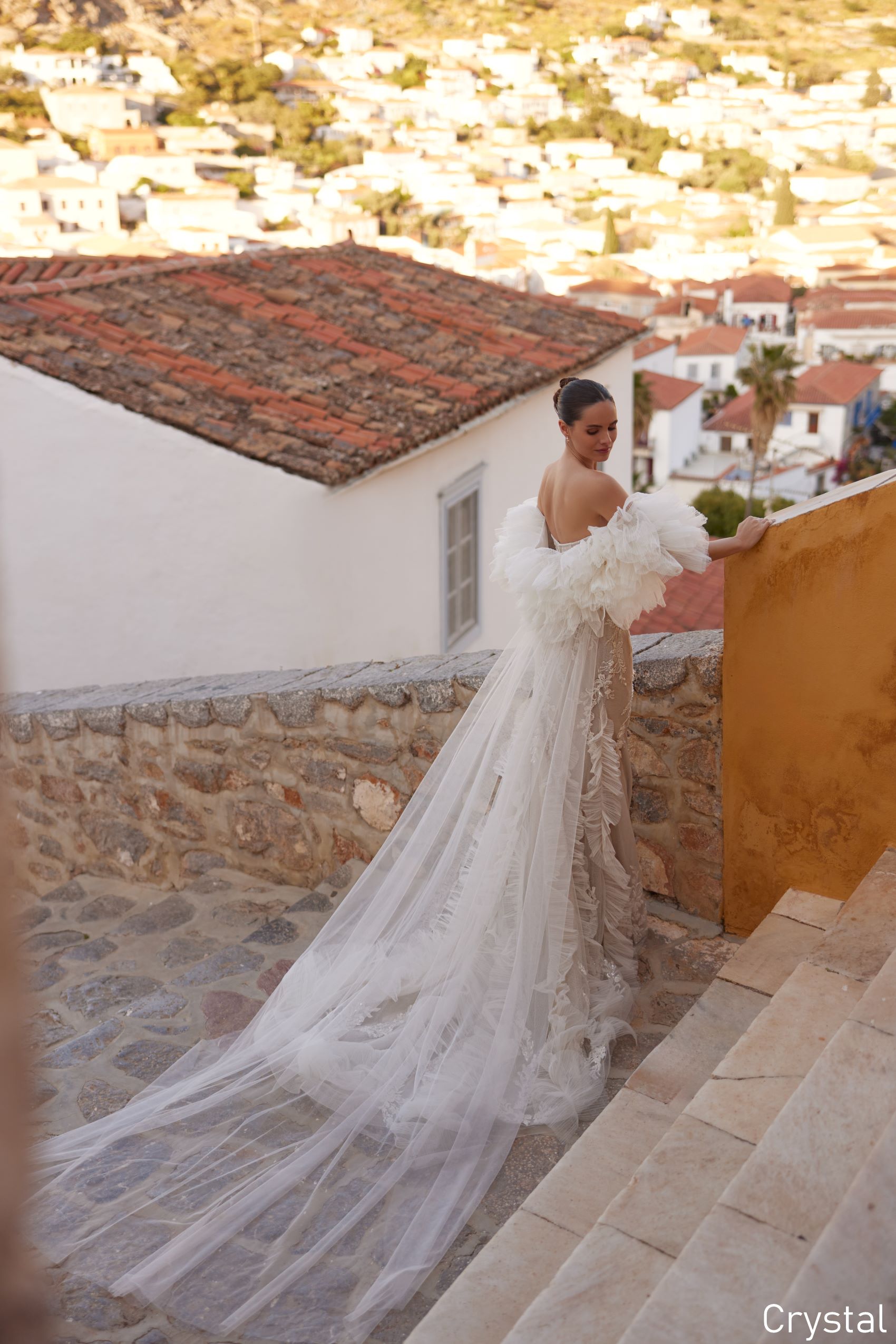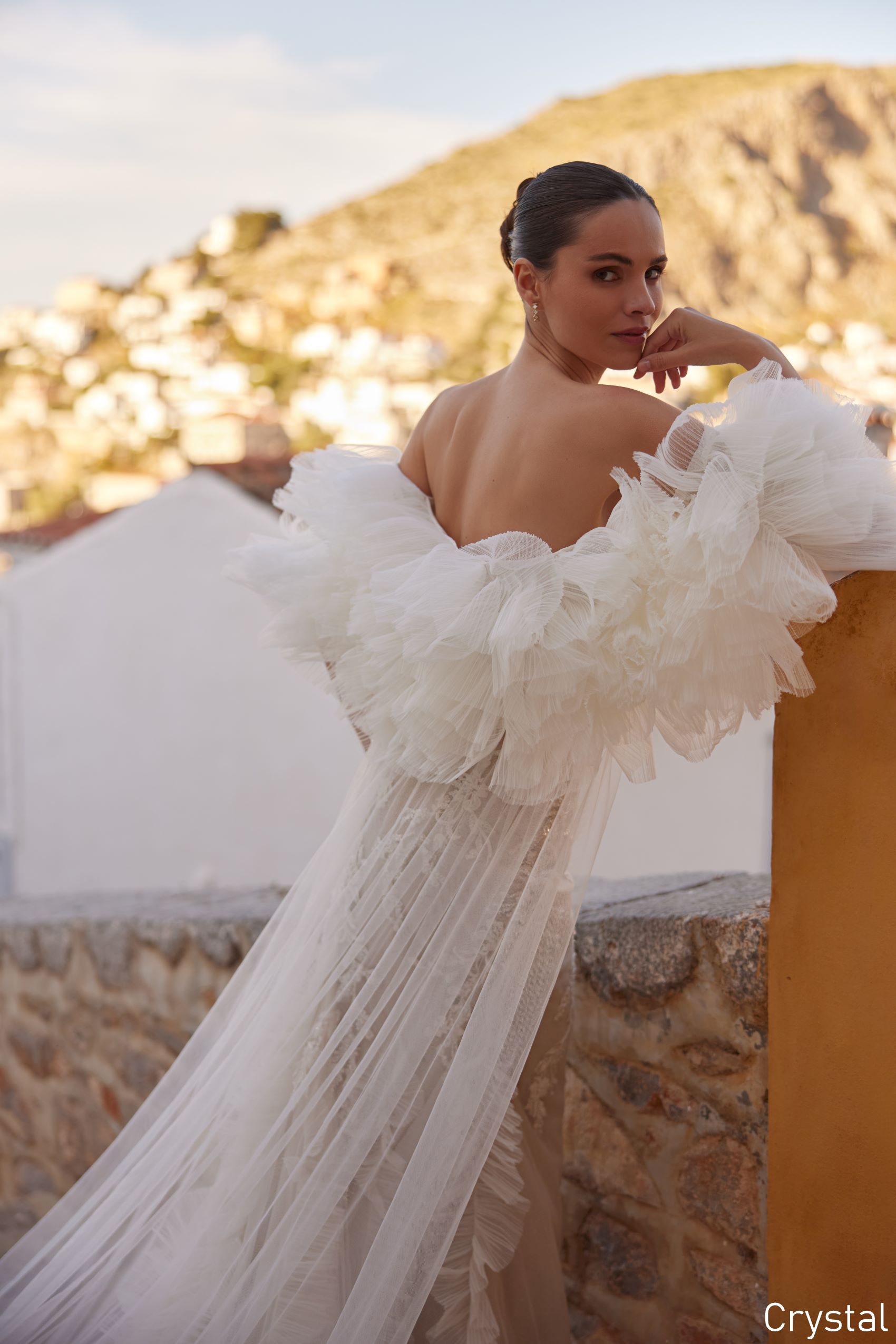 Crystal este rochia de mireasă tip sirenă care îmbină senzualitatea modernă cu rafinamentul detaliului couture. Corsetul cu inserții transparente evidențiază silueta și este împodobit cu broderii florale 3D și aplicații prețioase care captează lumina la fiecare pas. Mânecile bufante detașabile, din tulle plisat vaporos, adaugă o notă dramatică și romantică în același timp. Fiecare detaliu este creat să reflecte o mireasă sofisticată, feminină și memorabilă.