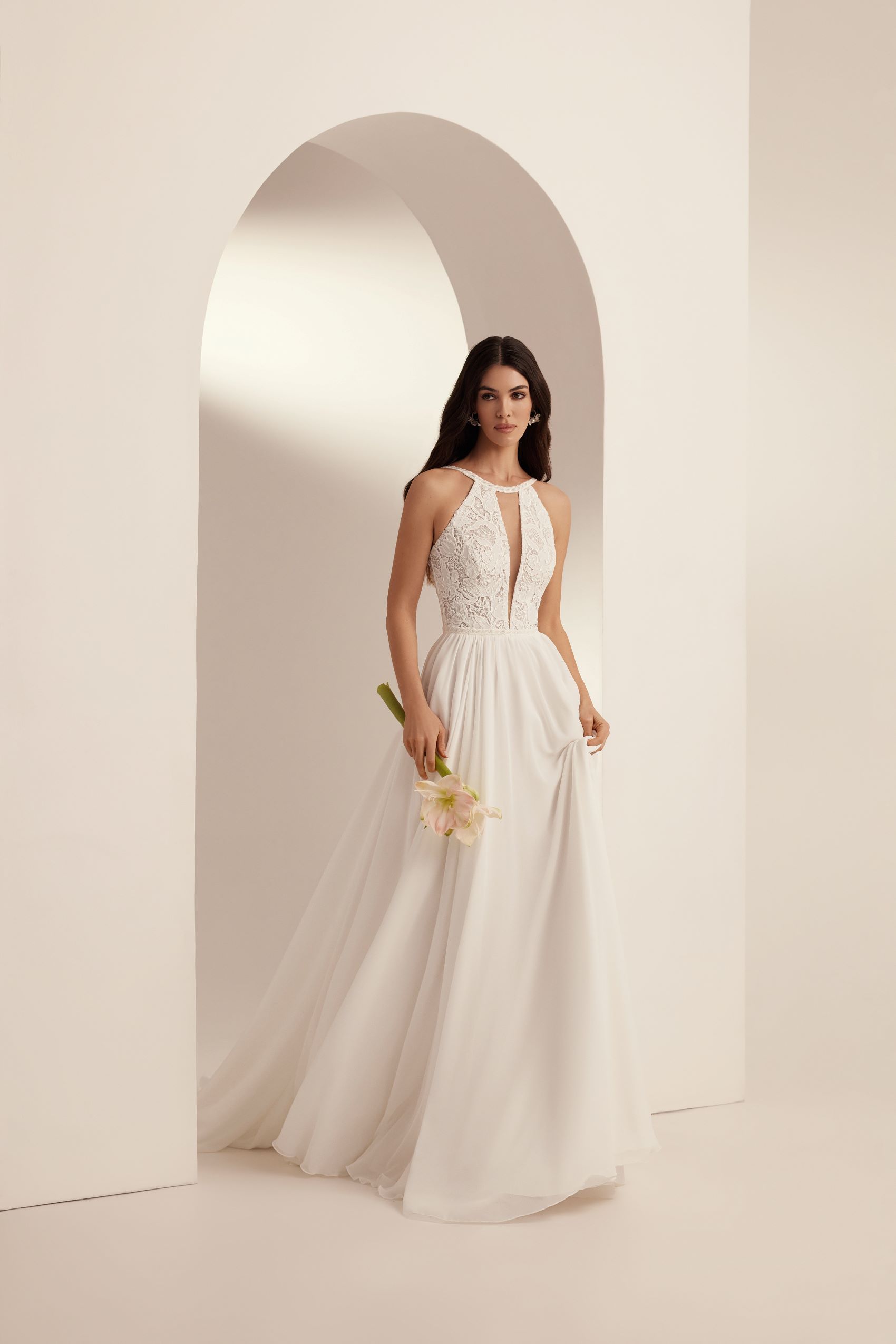 The Elionor A-line wedding dress is a sophisticated choice for brides who want to emphasize their individuality and style. The combination of American halter neck and V-neck covered with flesh-colored mesh adds intrigue and modern sound to the look.