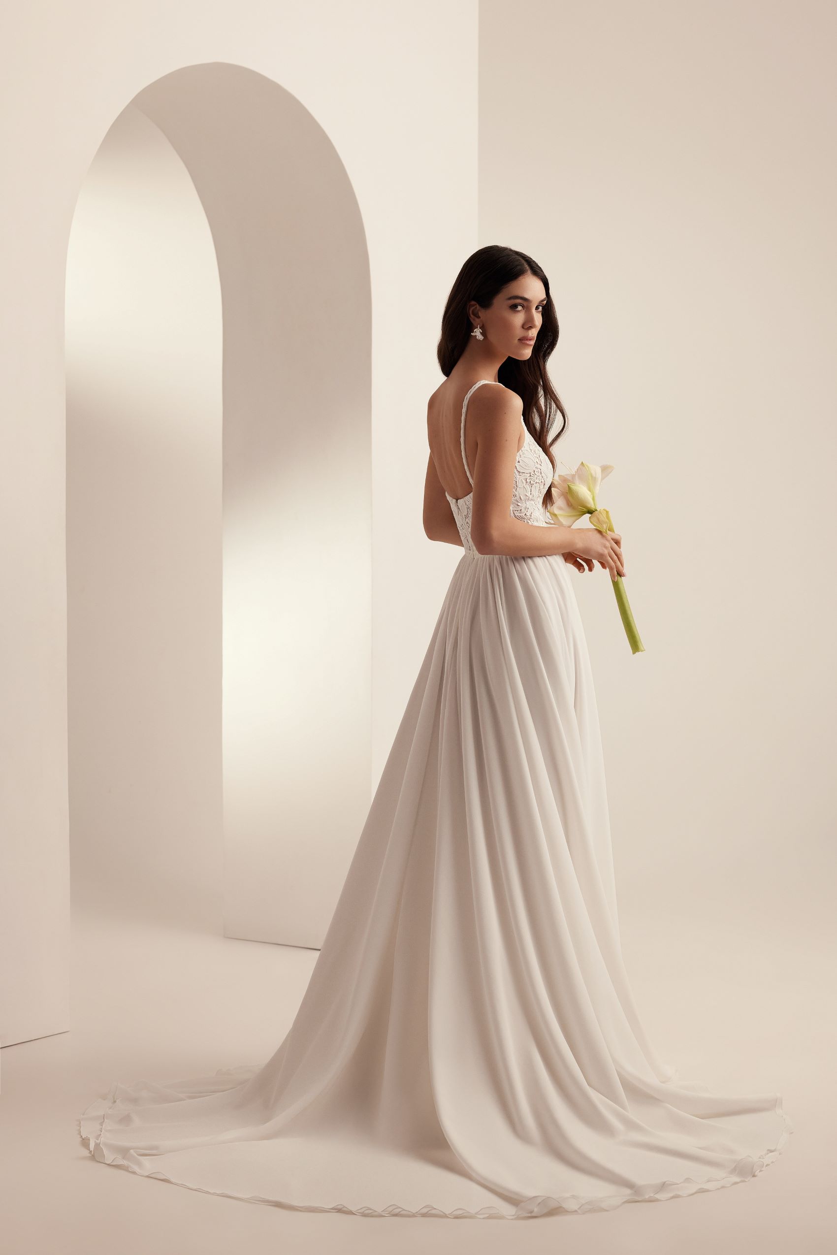 The cream mesh corset is adorned with large embroidered tulips that add volume and elegance to the dress. The neckline smoothly flows into the straps on the back, creating a harmonious silhouette and providing comfort. A lightweight chiffon skirt with a gathered waist and sateen lining flows with every movement, emphasizing the naturalness and tenderness of the look. The textured lace “pigtails” that adorn the neckline and belt add originality and a sophisticated detail to the design. The Elionor is perfect for a romantic European-style wedding in a cozy garden location, vineyard, or small chapel. Its unique design will help the bride look truly unforgettable.