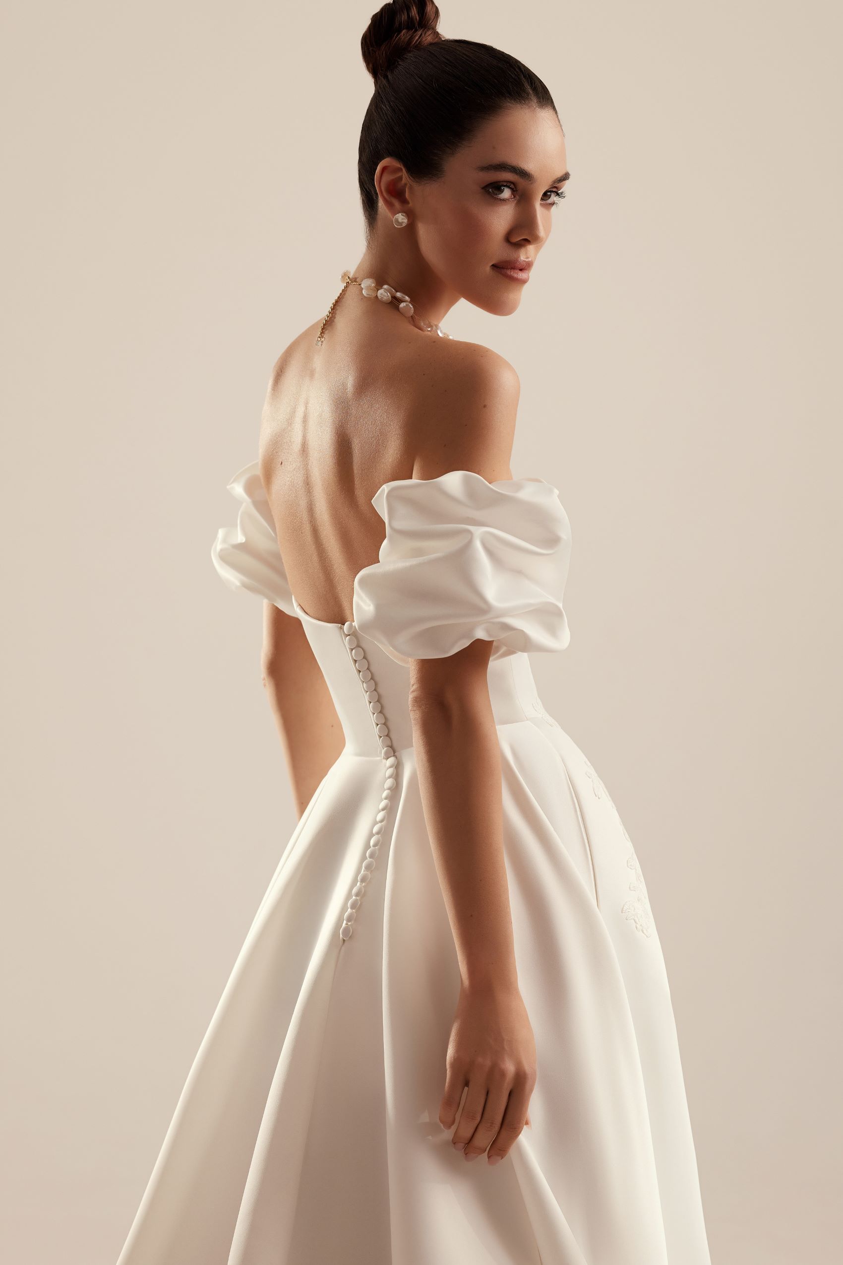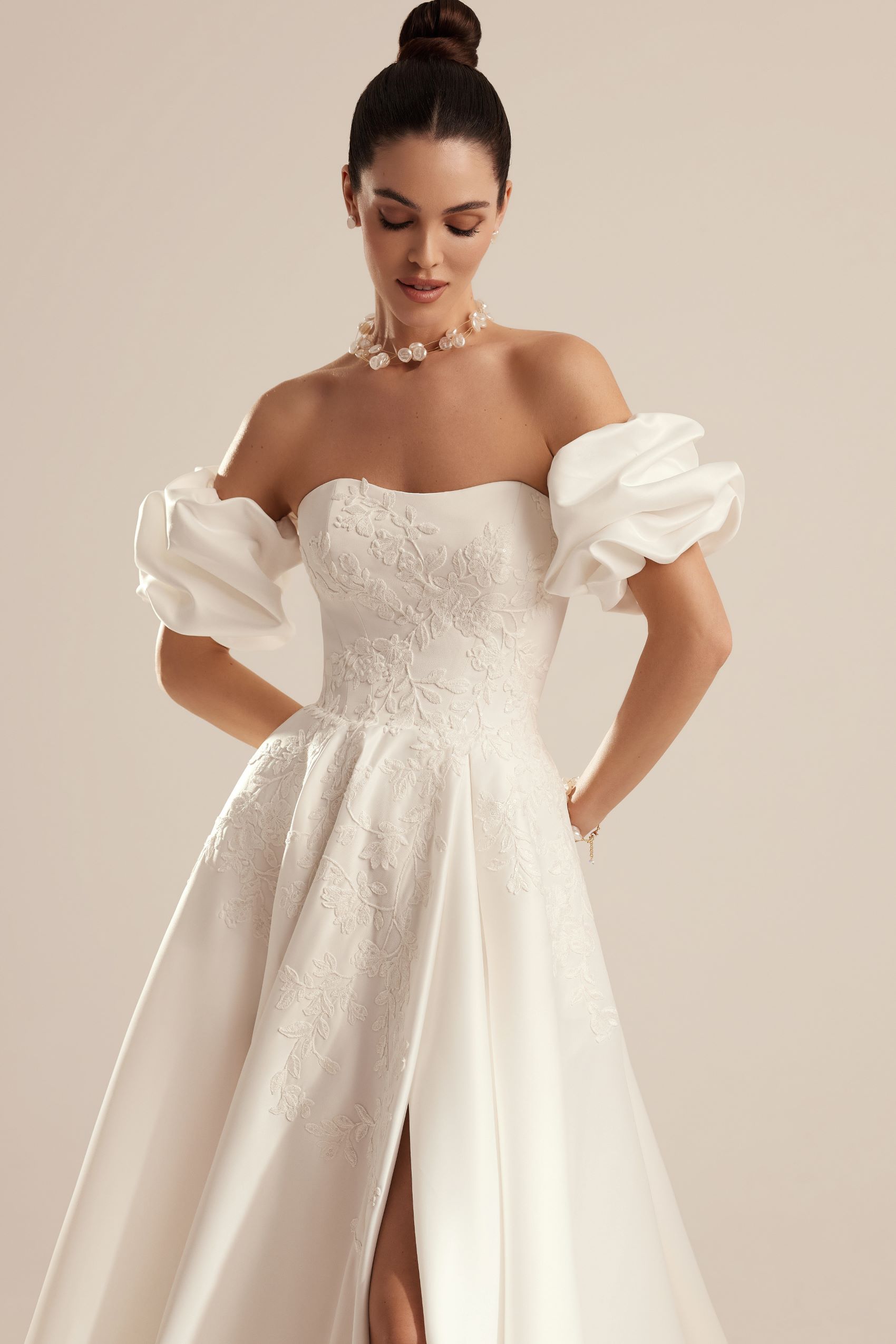 The Isabel wedding dress is a combination of classic elegance and modern comfort. The bustier top with internal lacing not only adds sophistication to the look, but also guarantees a perfect fit. Thanks to the detachable voluminous short sleeves, the look can be changed throughout the day. The fluffy skirt has pleats at the waist, a wrap slit, hidden pockets in the side seams, and a short lower skirt for comfort. The bottom of the dress is reinforced with a stiff line that guarantees the stability of the fluffy silhouette. The dress is made of dense, expensive satin that holds its shape perfectly and fascinates with its delicate shine. The corset and skirt are embellished with matte textured lace, which adds depth and textural variety to the look, focusing on the details. Functional buttons over the zipper add classic charm and harmoniously complete the design.