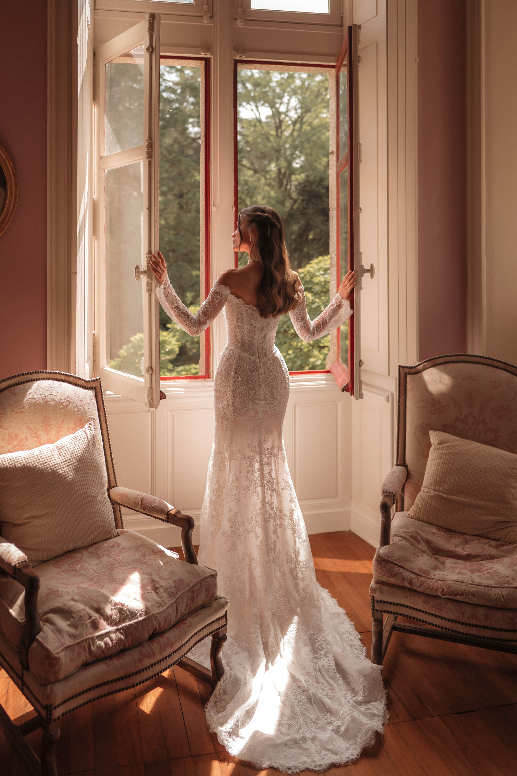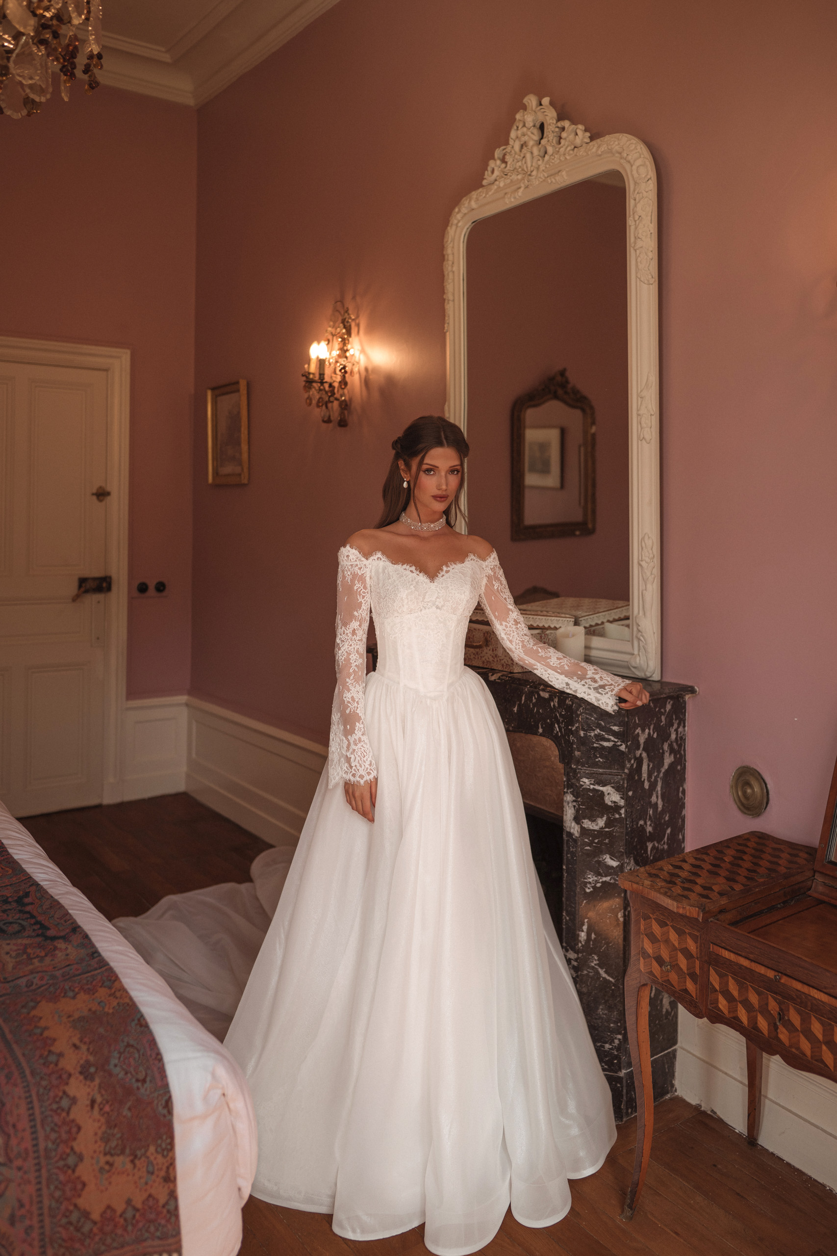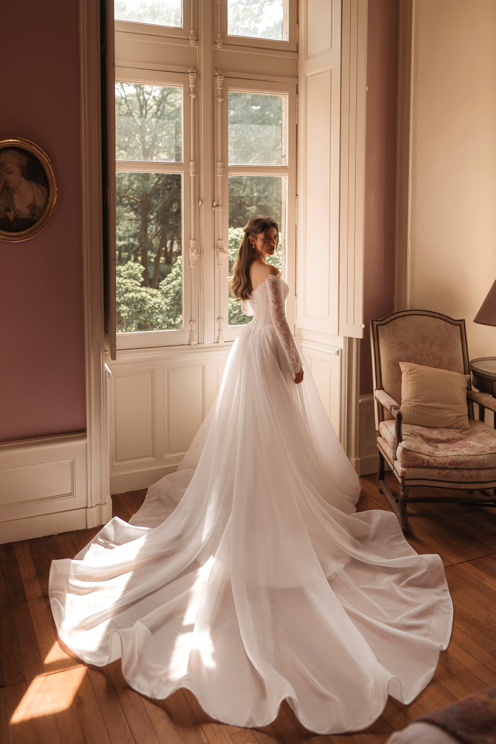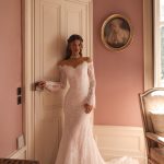 Mânecile lungi din dantelă delicată și trena elegantă completează designul, transformând Jada într-o rochie memorabilă, ideală pentru miresele care își doresc să îmbine tradiția cu un plus de modernitate.