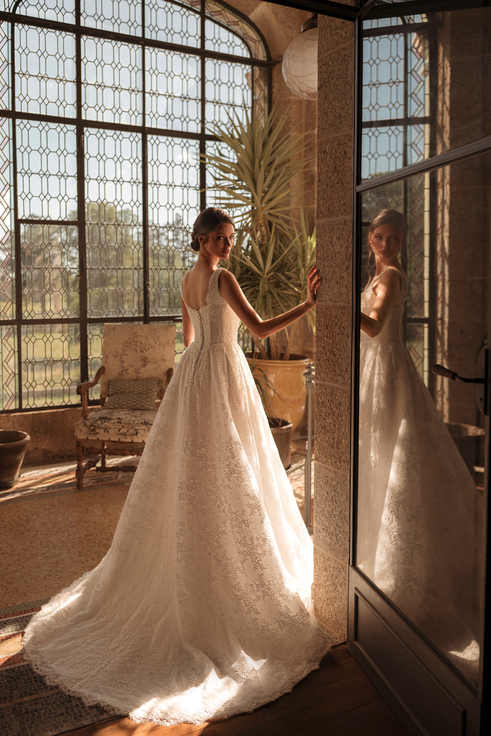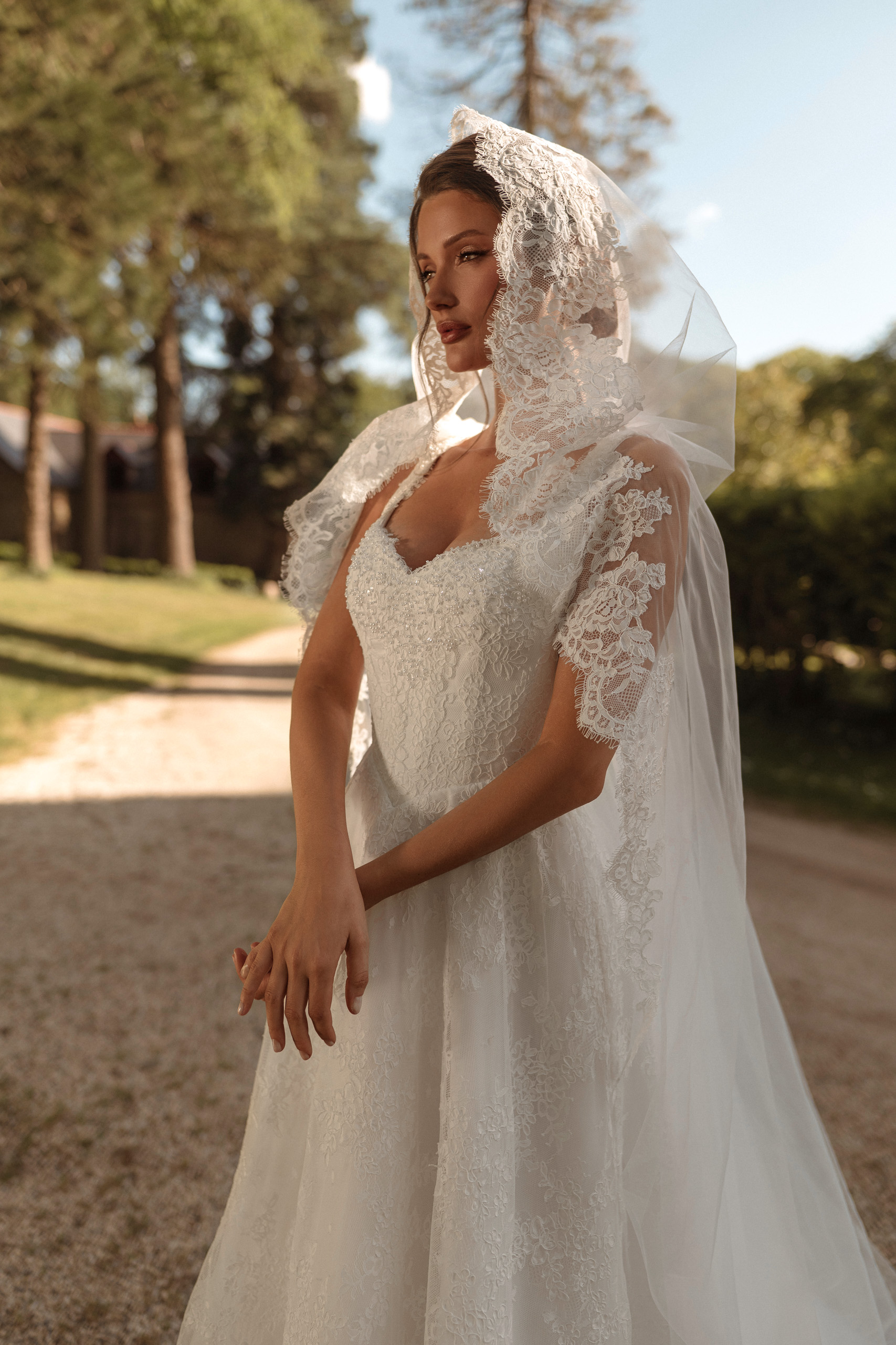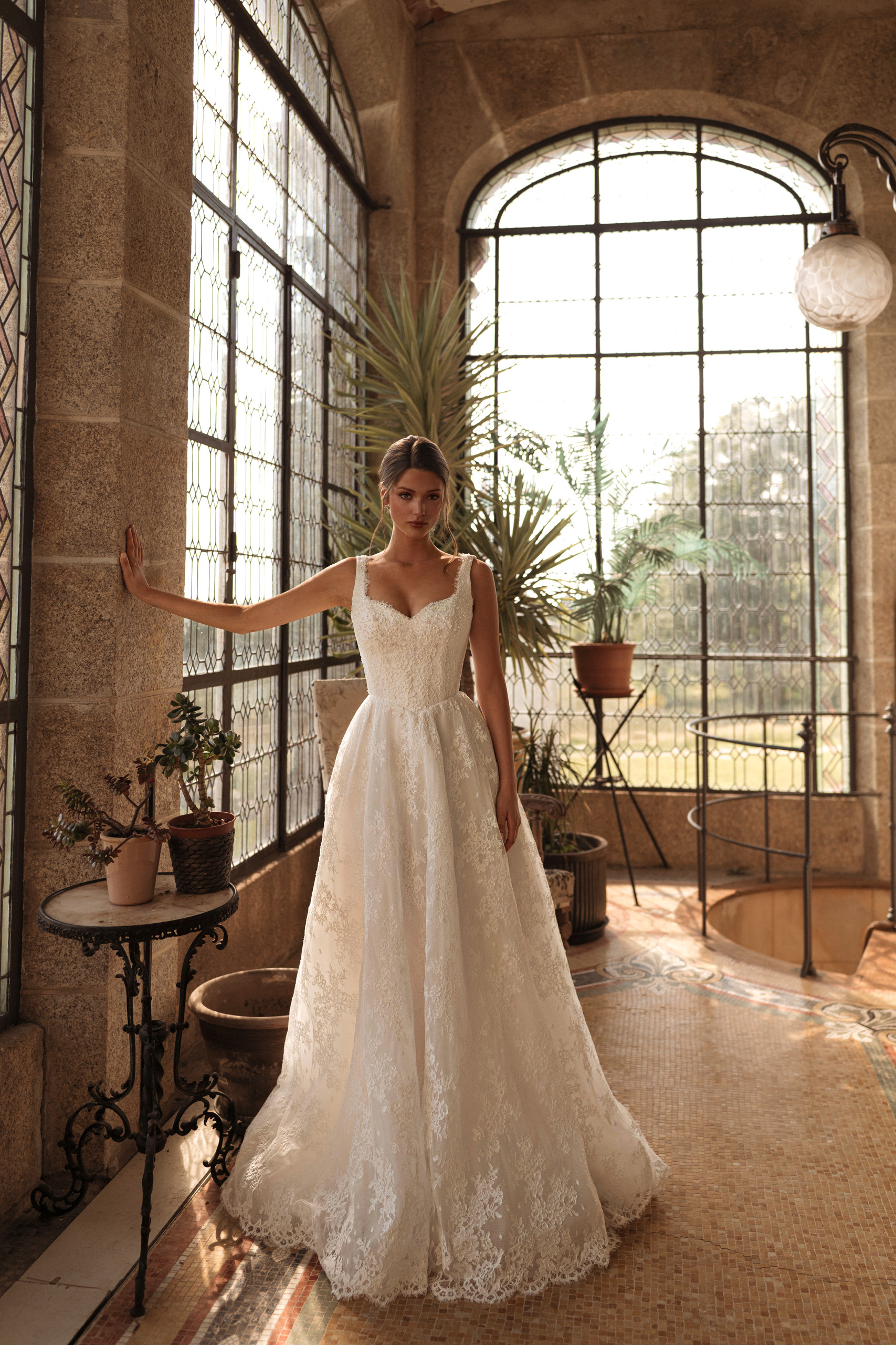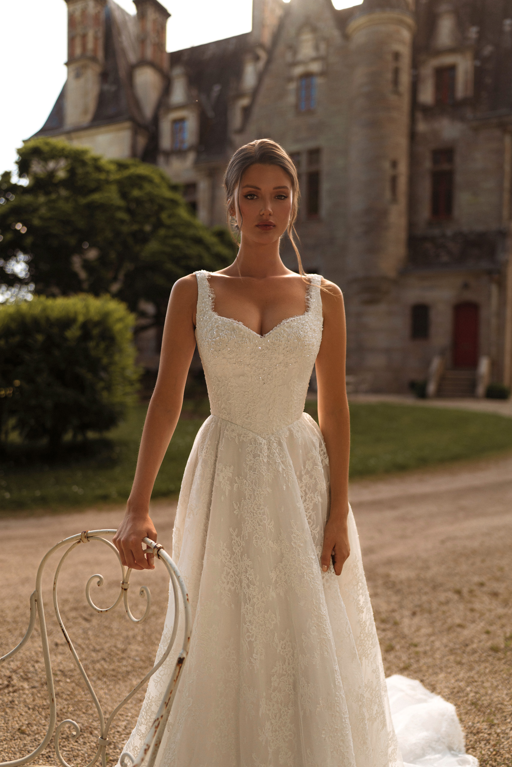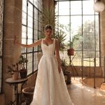 Rochia de mireasă Kara impresionează prin delicatețea dantelei fine și croiala clasică reinterpretată cu o notă couture. Bustul tip corset cu bretele late și decolteu inimă subliniază eleganța naturală, punând în valoare grația și feminitatea.