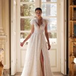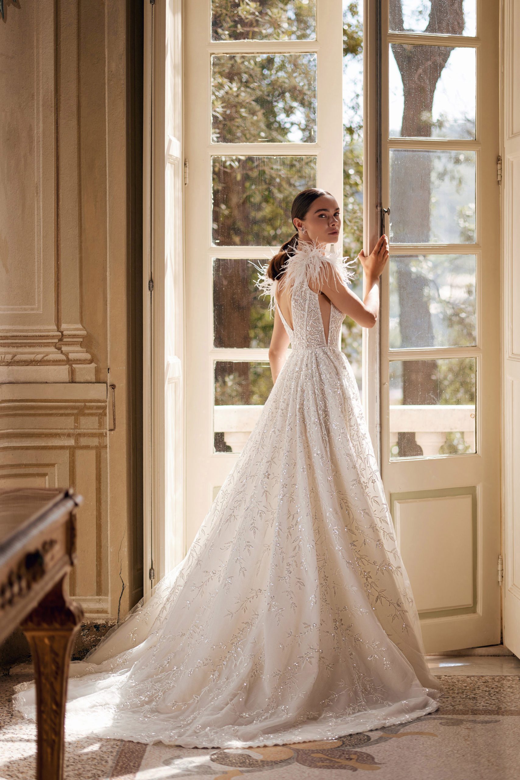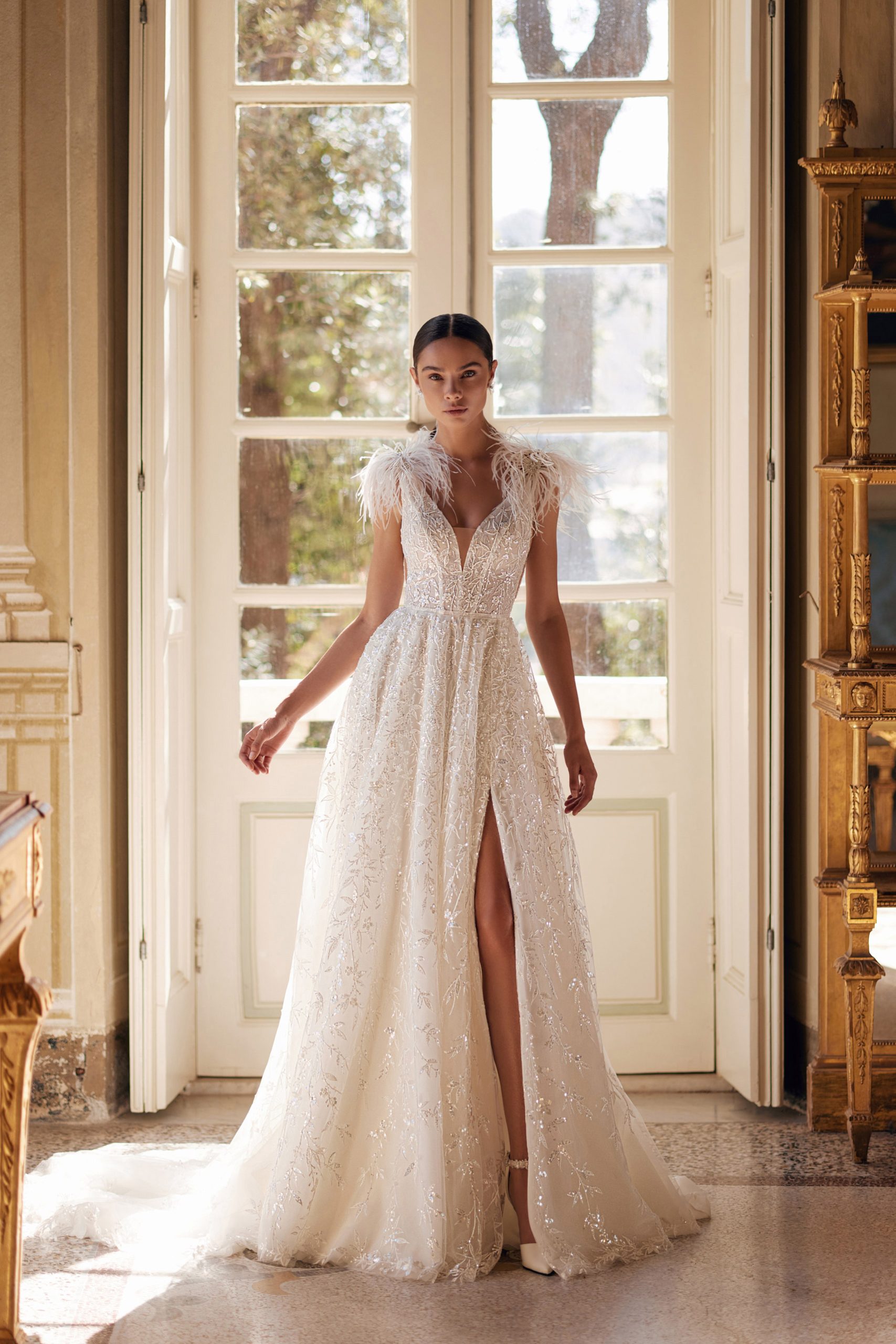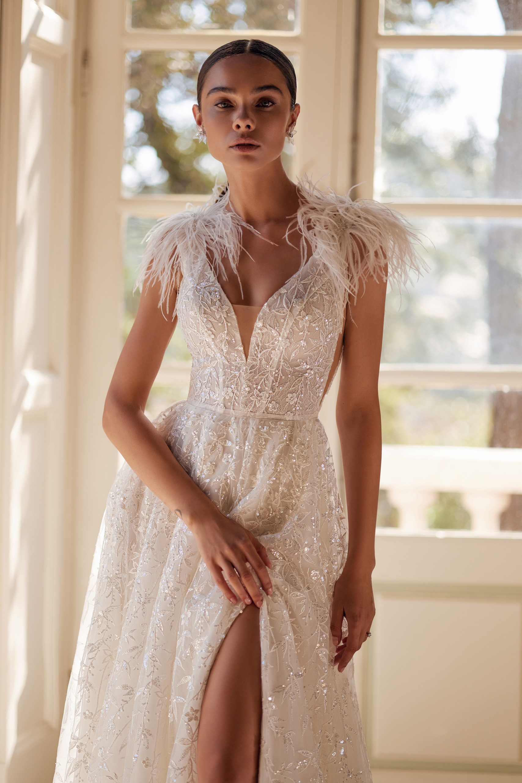 The Lesley A-line dress with a leg slit combines hints of glamour with romantic style. The delicate guipure with floral motifs is completely embroidered with sequins of different sizes, which give an extraordinary shine. The shoulders are adorned with ostrich feathers and, with every breeze, add mobility to the dress. It is worth paying attention to the transparent inserts on the sides, which echo the V-neck back