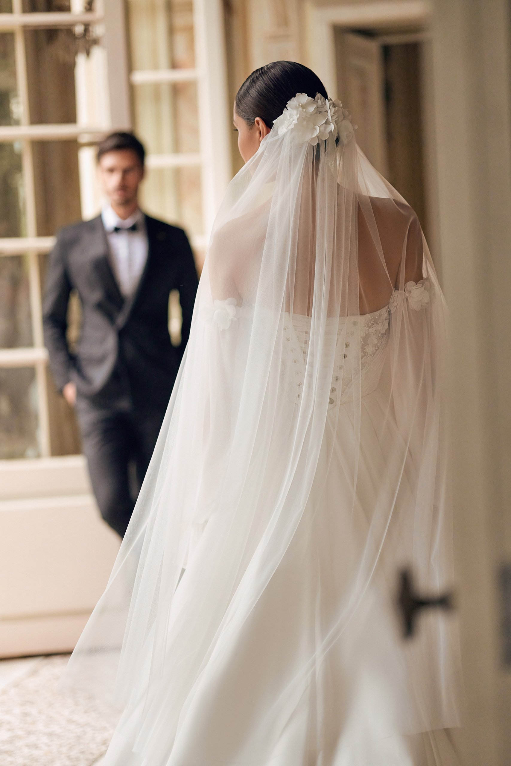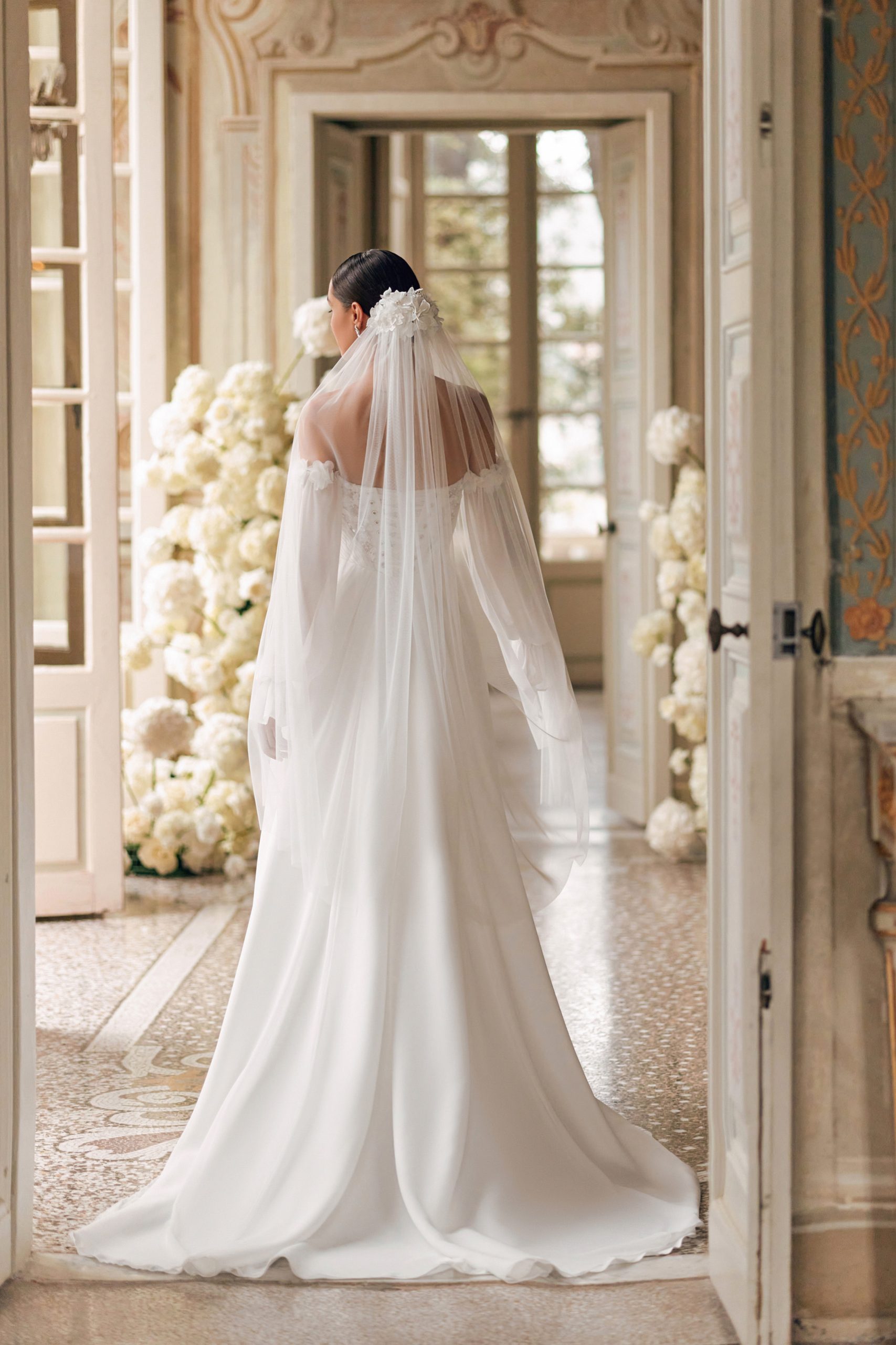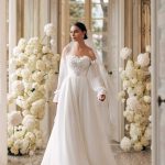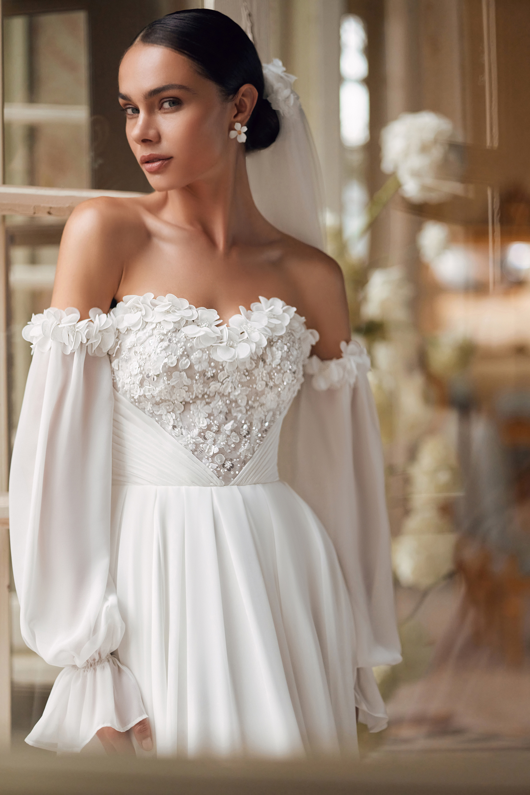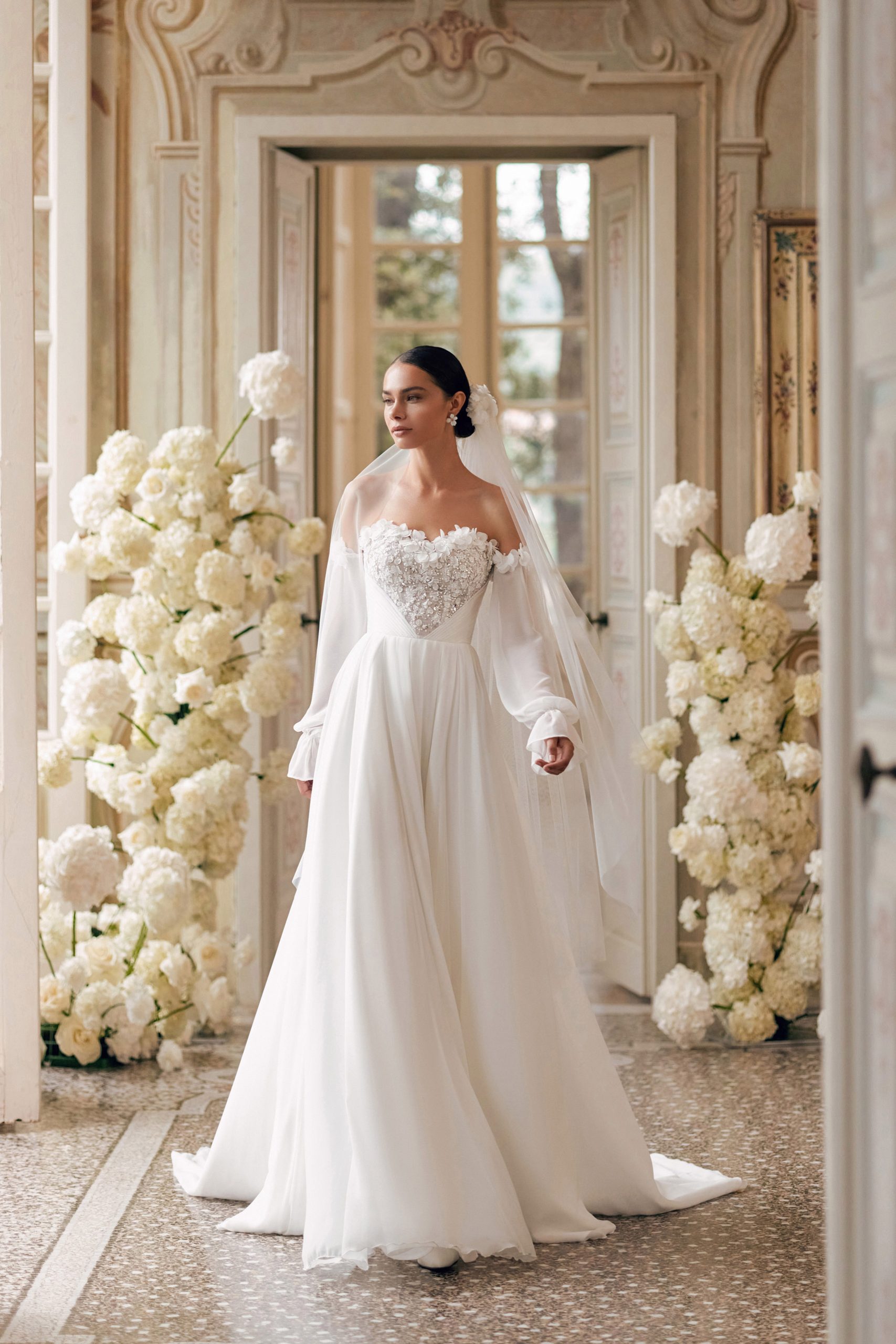 The romantic Lisa A-line dress features a light chiffon train skirt and a corset with 3D ornamentation. The bodice is embroidered with handmade flowers and leaves, pearls, bugle beads, and sequins. The diagonal draping towards the center of the waist creates a textured heart on the corset made of flowers. The airy lowered sleeves are also adorned with flowers. And the back of the corset features lacing.