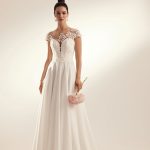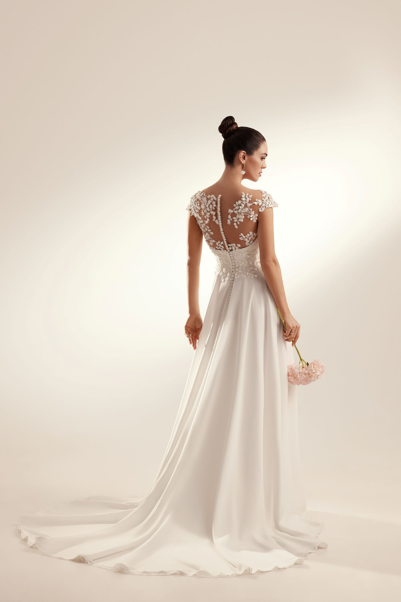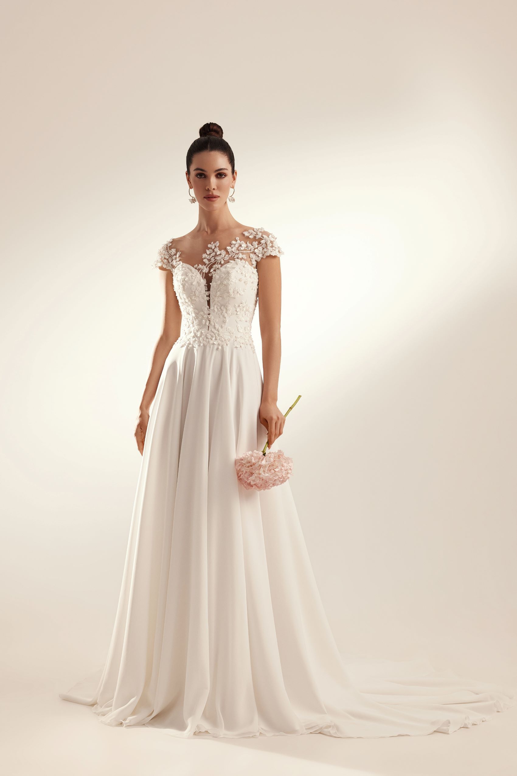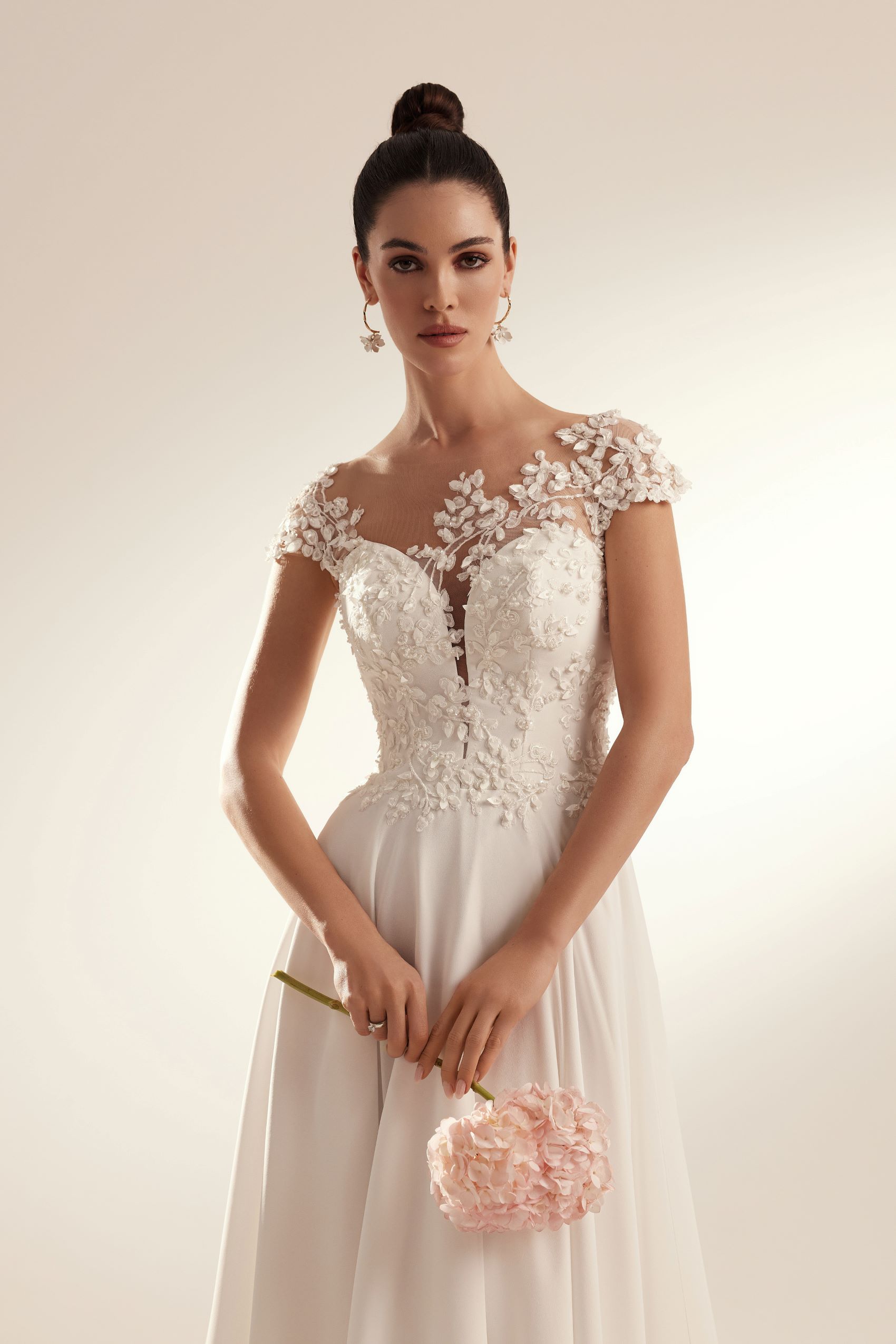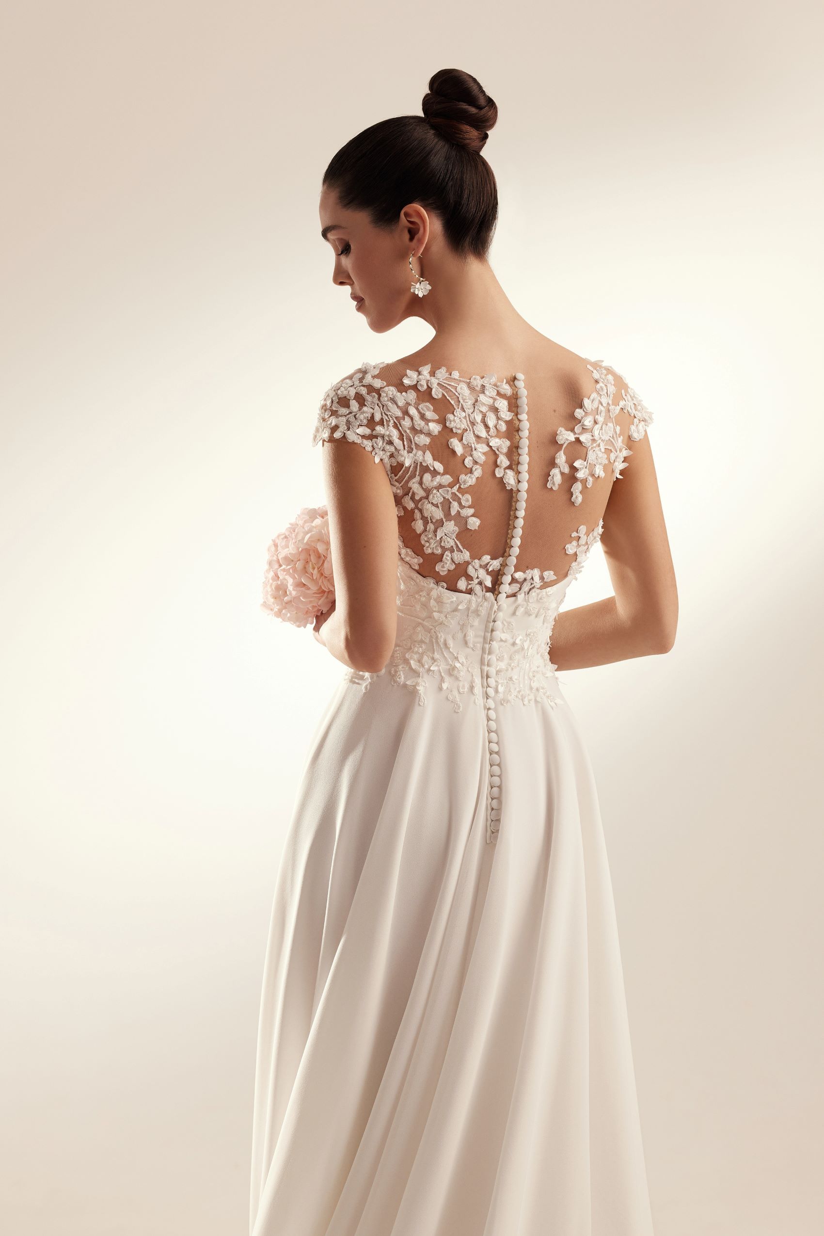 The Marlena A-line wedding dress is a sophisticated choice for brides who want to achieve a classic and light look. The top with a deep, flowing neckline covered with nude mesh adds restrained sensuality, while short, one-piece sleeves complete the elegance of the upper part of the dress. The corset is made of dense satin covered with delicate lace and looks luxurious and very tender. The asymmetrical ornamentation in the form of 3D twigs with leaves adds volume and texture, smoothly transitioning to the skirt. It is made of lightweight chiffon, satin, and sateen lining, which ensures softness and smoothness of movement. The back has a buttoned yoke of nude mesh and a zipper, covered by a placket and buttons on the main part of the dress, which adds convenience and aesthetic completeness to the design. The Marlena follows the latest wedding trends that focus on 3D patterns and asymmetrical details. This dress is perfect for a European-style wedding ‒ in a luxurious mansion, vineyard, or among the beauty of the garden. A bride wearing the Marlena dress will look elegant and romantic.