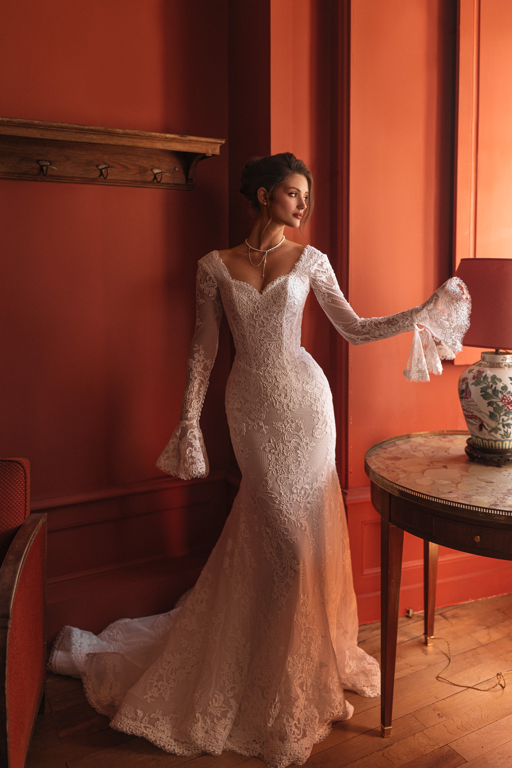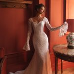 Rochia de mireasă Meadow îmbină romantismul vintage cu delicatețea modernă. Croiul sirenă, realizat integral din dantelă fină, evidențiază grațios silueta, în timp ce mânecile lungi evazate, cu detalii de inspirație victoriană, adaugă un aer regal și misterios. Decolteul în formă de inimă și spatele senzual completează perfect acest design unic.