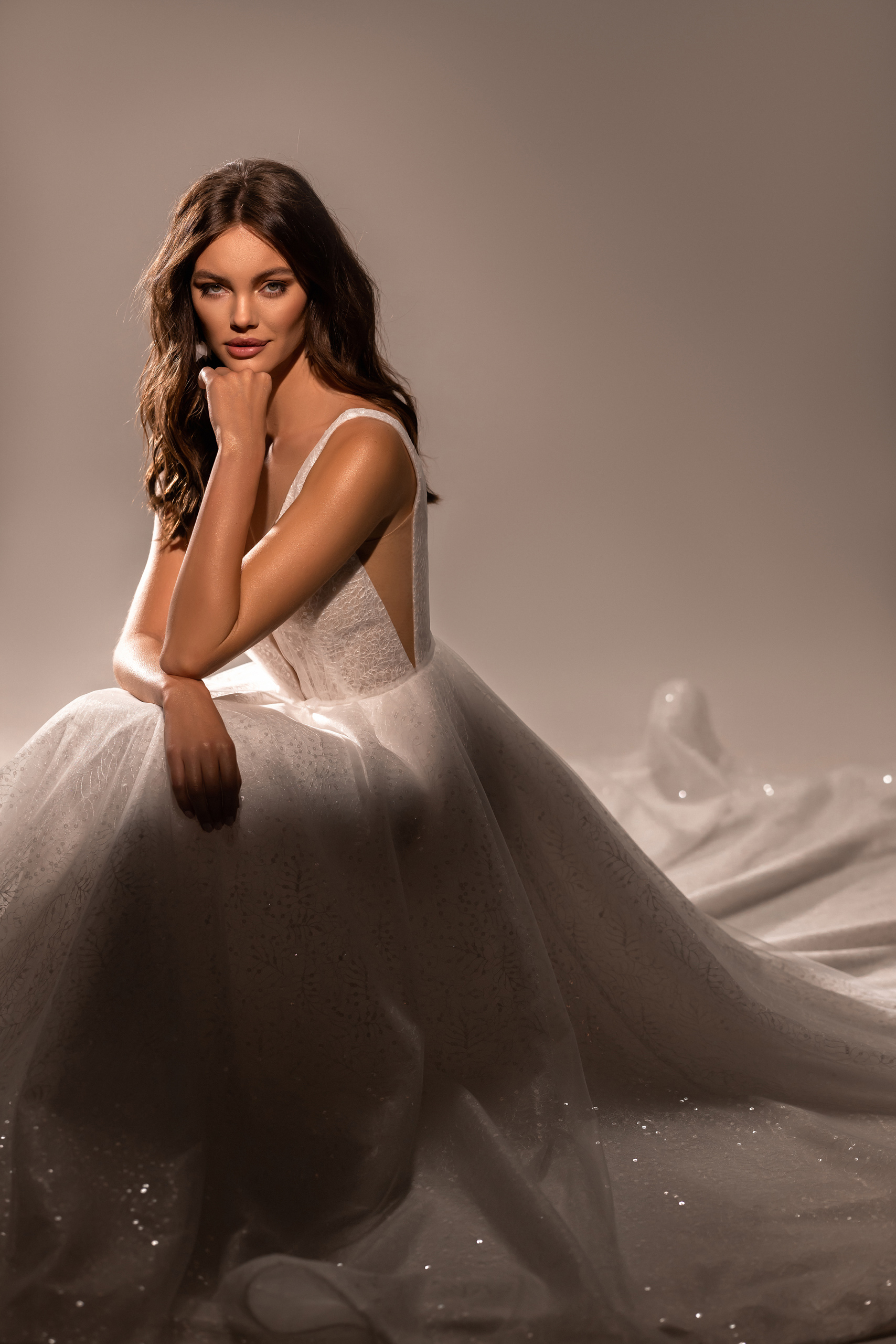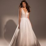 The Monica A-line dress is designed for romantic brides. The deep V-neckline and transparent inserts are covered with mesh. The dress has an open back, a long train and a miniature bow at the waist. The shine of the fabric adds radiance and magic to the image.