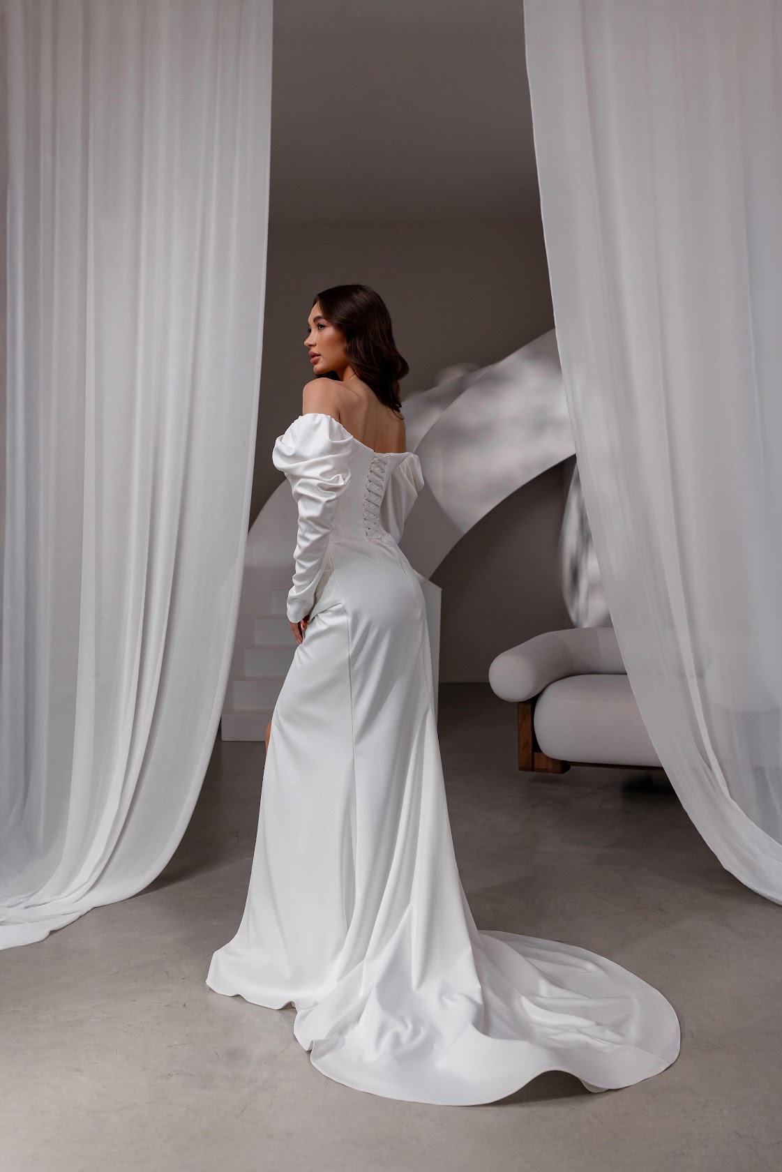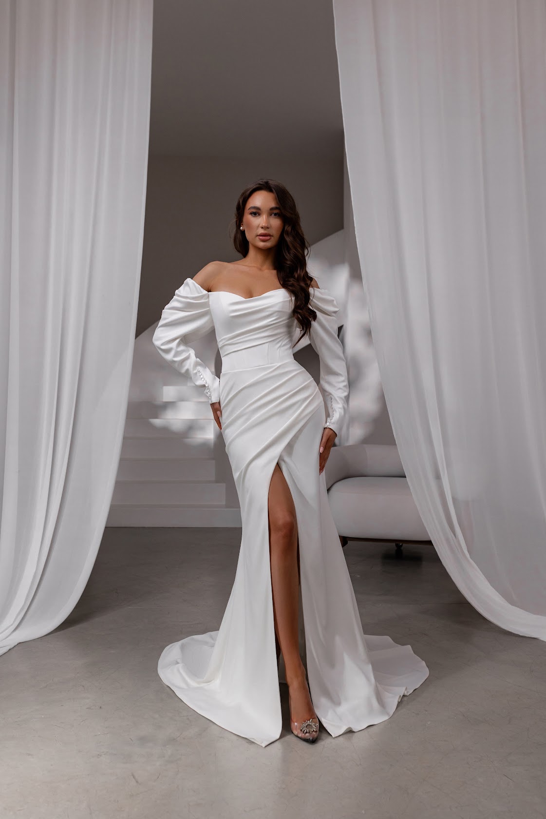 Rochia de mireasă Murmur este alegerea ideală pentru miresele moderne care își doresc o apariție sofisticată și seducătoare. Croiala tip sirenă, cu slit frontal și mâneci lungi bufante, îmbină dramatismul cu eleganța atemporală. Corsetul drapat pune în valoare linia bustului, în timp ce talia bine conturată accentuează silueta.