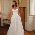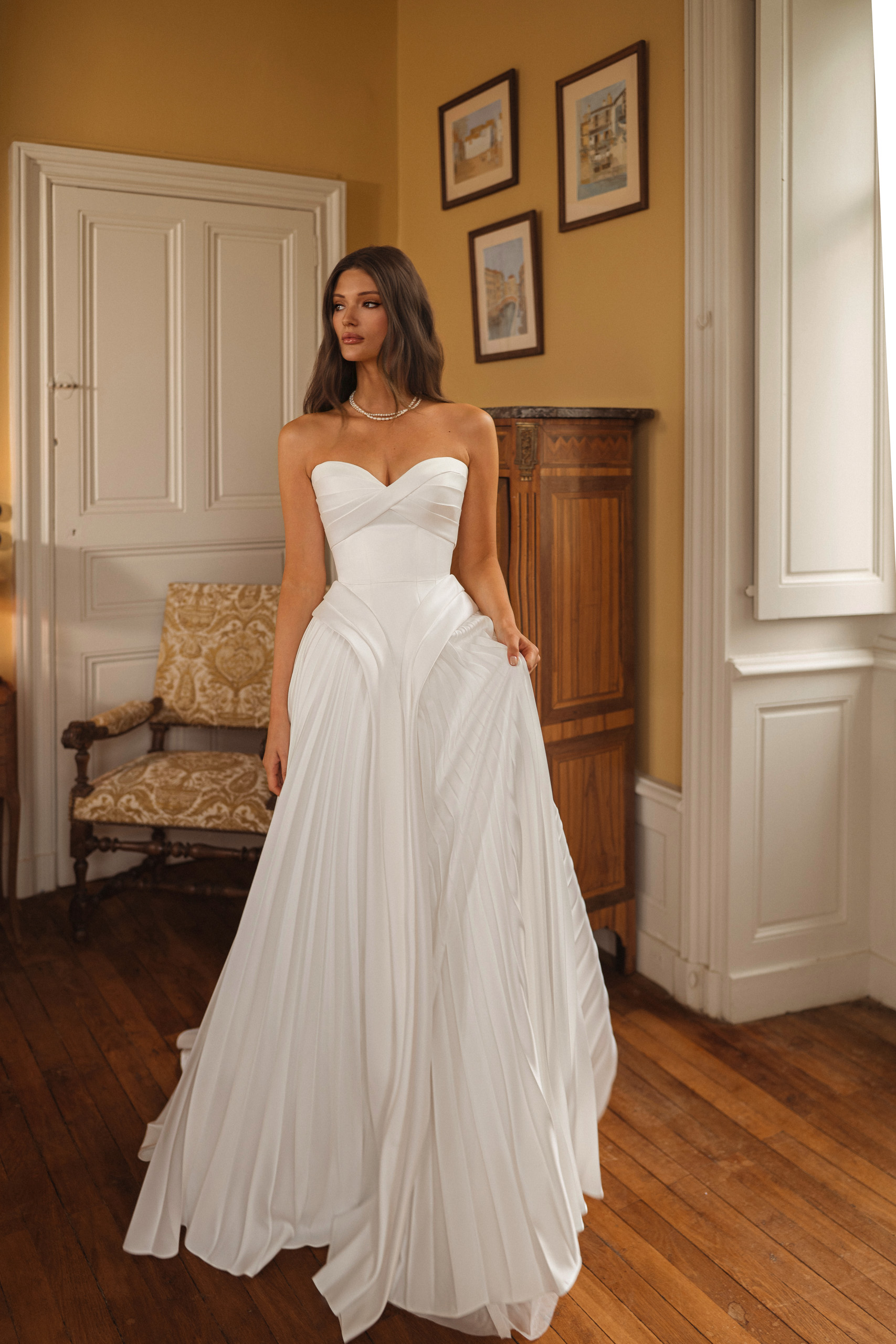 Musetta este o rochie de mireasă minimalistă, dar extrem de rafinată, creată din satin de lux, ce captează lumina într-un mod spectaculos. Bustul tip inimă, cu drapaj fin, subliniază cu delicatețe linia umerilor, iar fusta amplă, plisată, creează un efect de mișcare fluidă și regală.