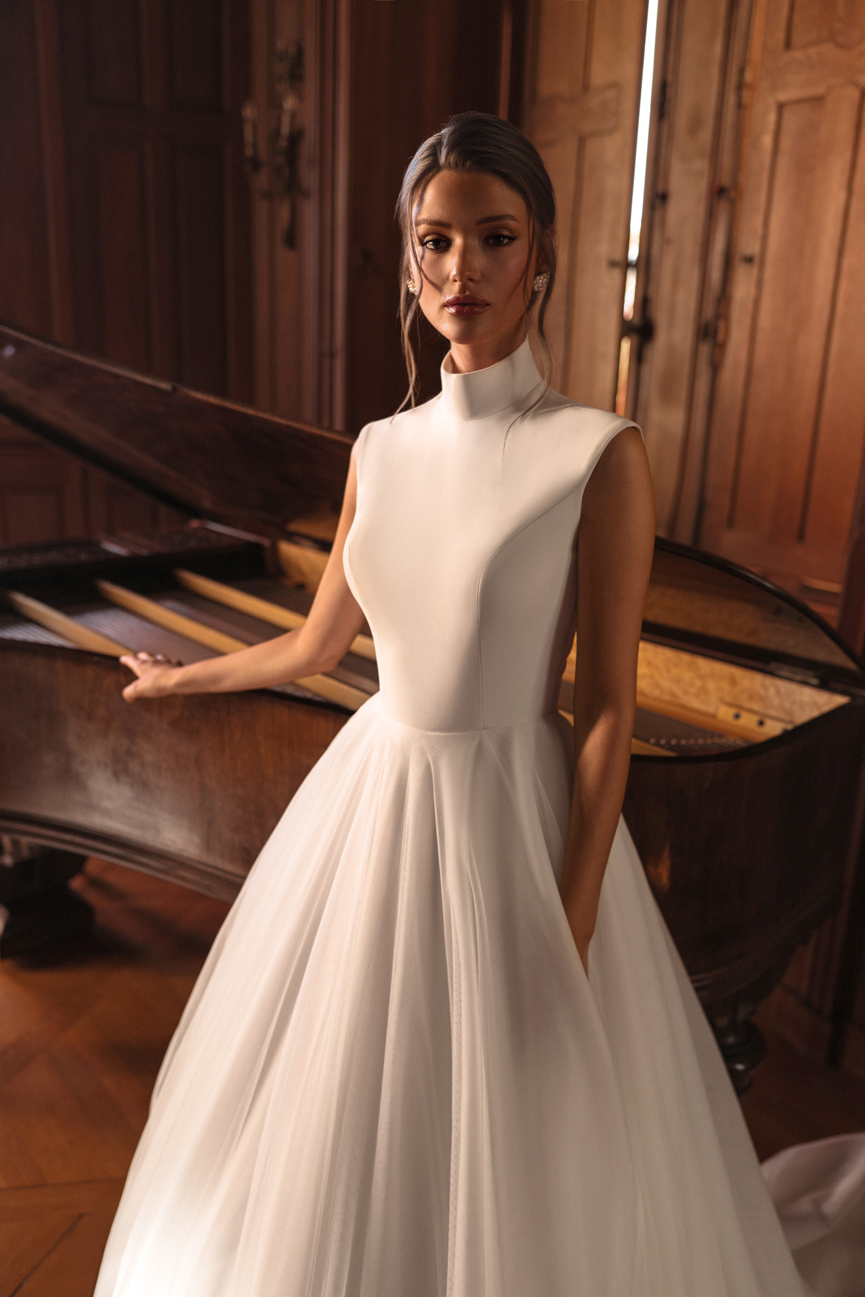 Pamela este genul de rochie care te cucerește din prima clipă. Liniile ei simple și elegante, gulerul înalt și fusta amplă din tulle spun totul despre rafinament și feminitate. Este pentru mireasa care își dorește să fie delicată, dar și puternică, să aibă acel aer de grație atemporală.