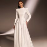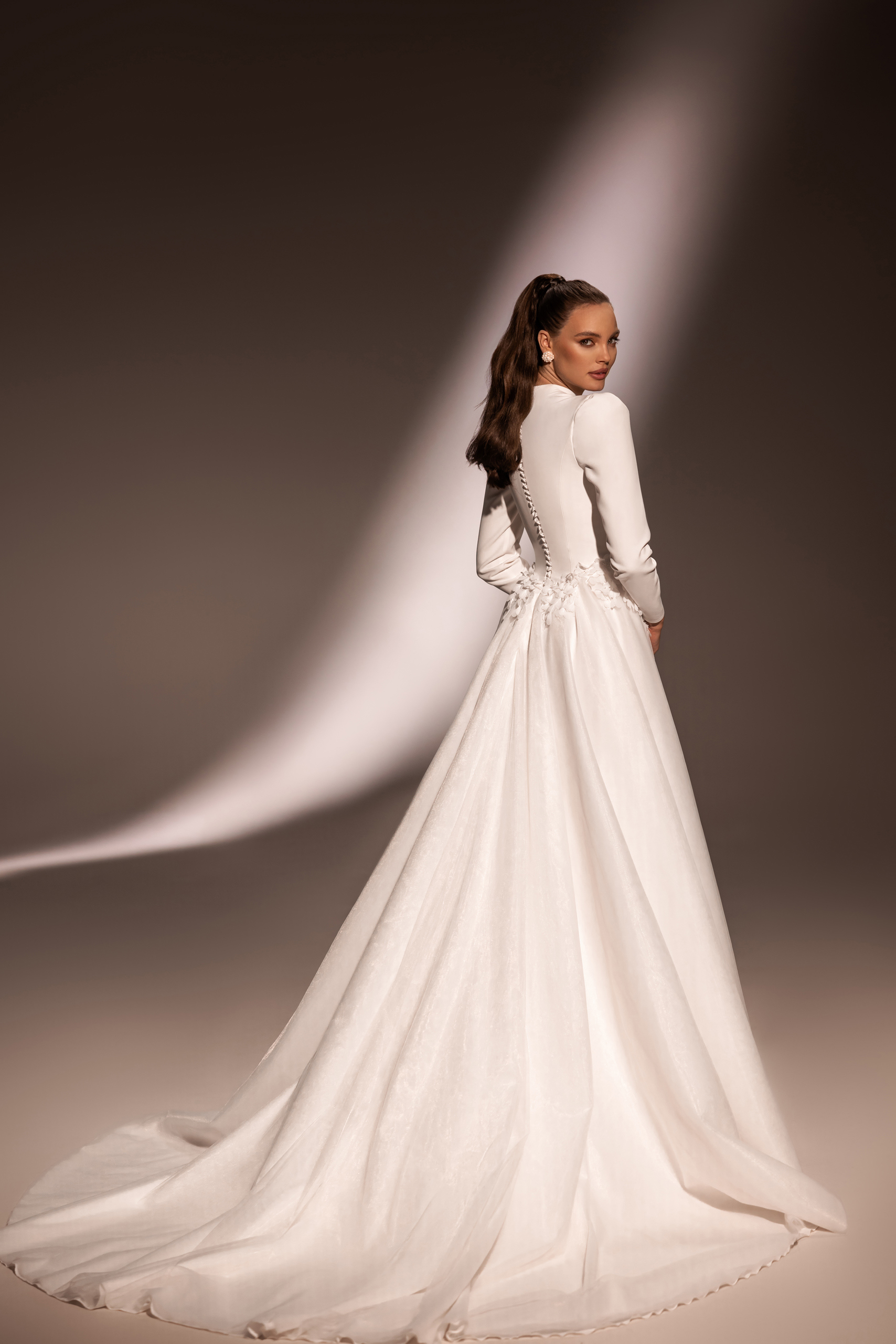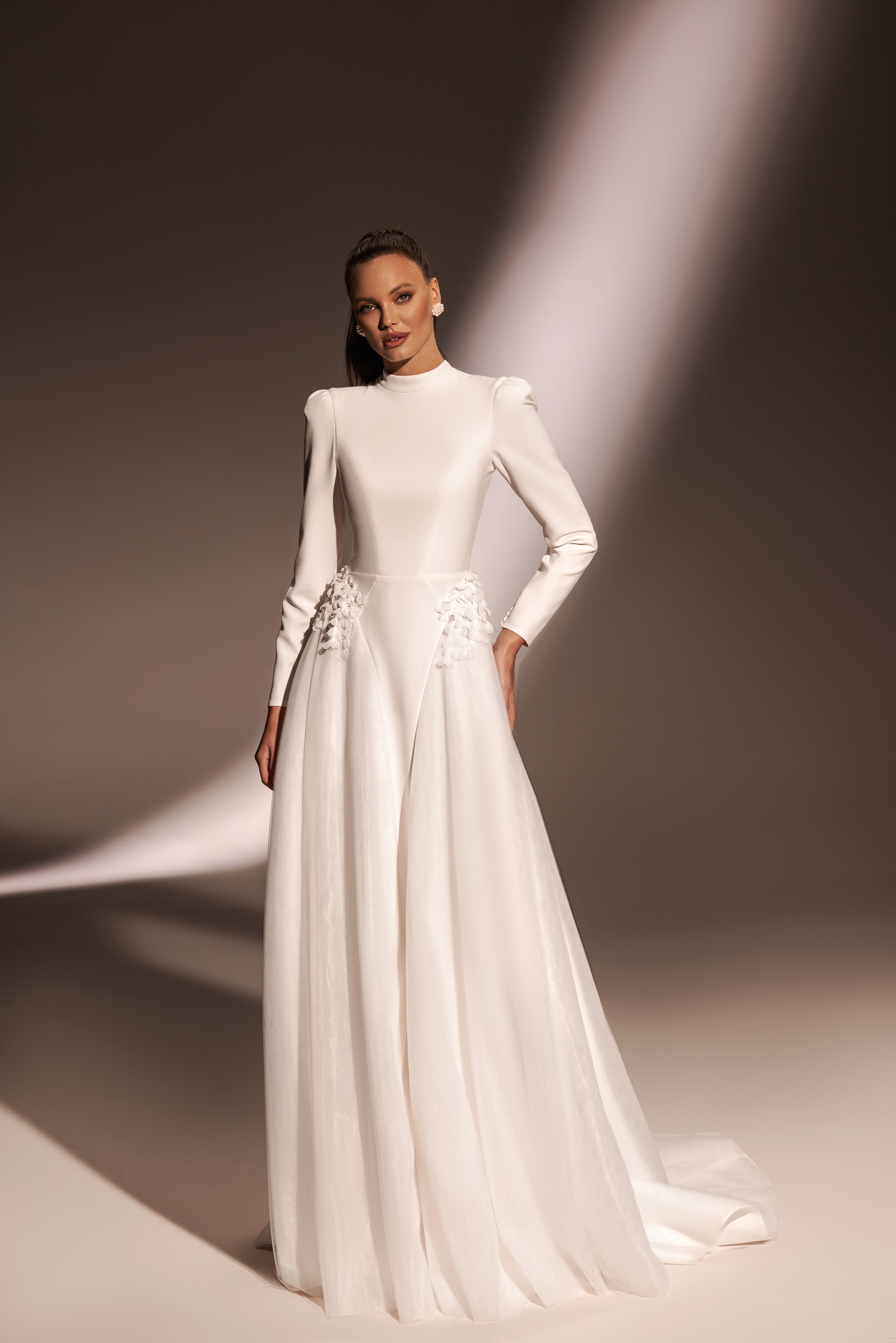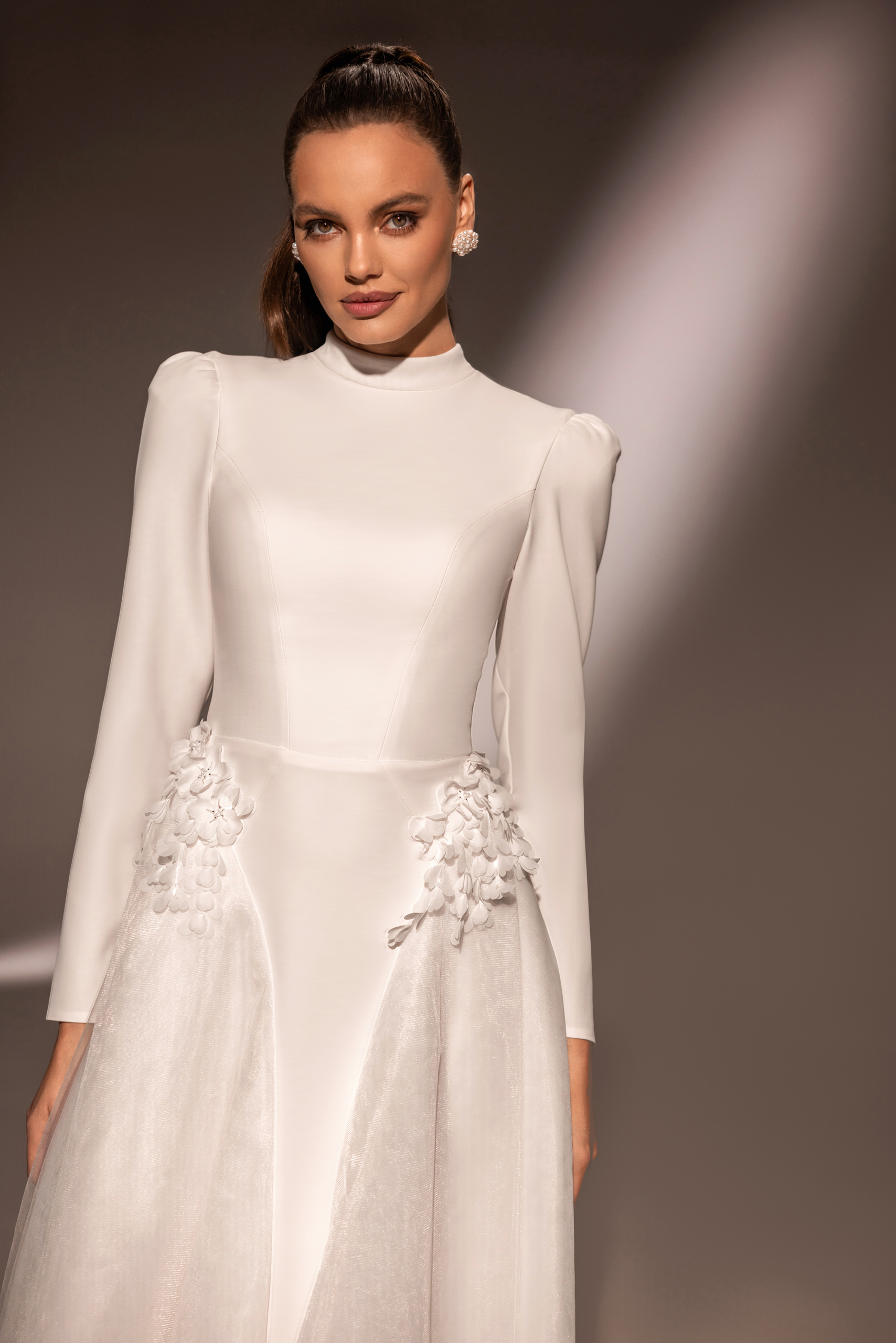 The Shelby dress is an example of how a fully covered minimalist look can be romantic. The top of the dress with long sleeves and a trendy stand-up collar is made of crepe, while the skirt is made of tulle and has a voluminous decoration, which makes the image delicate.