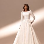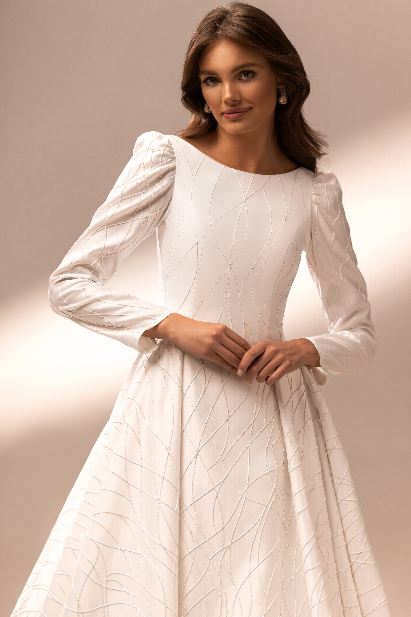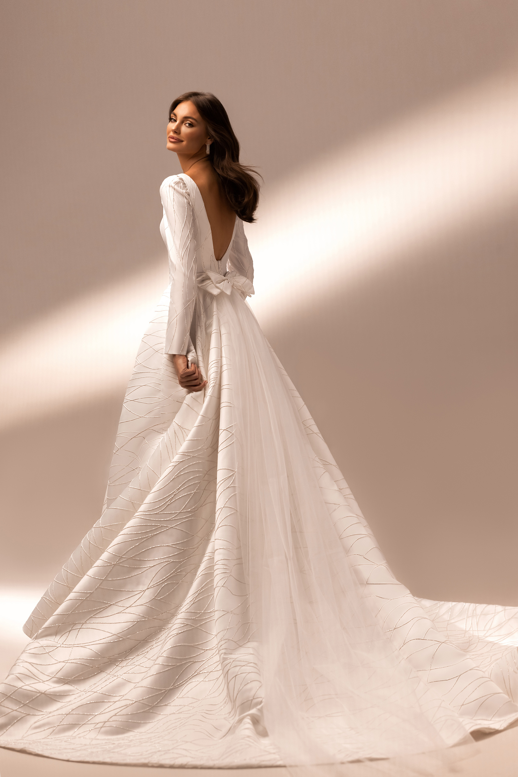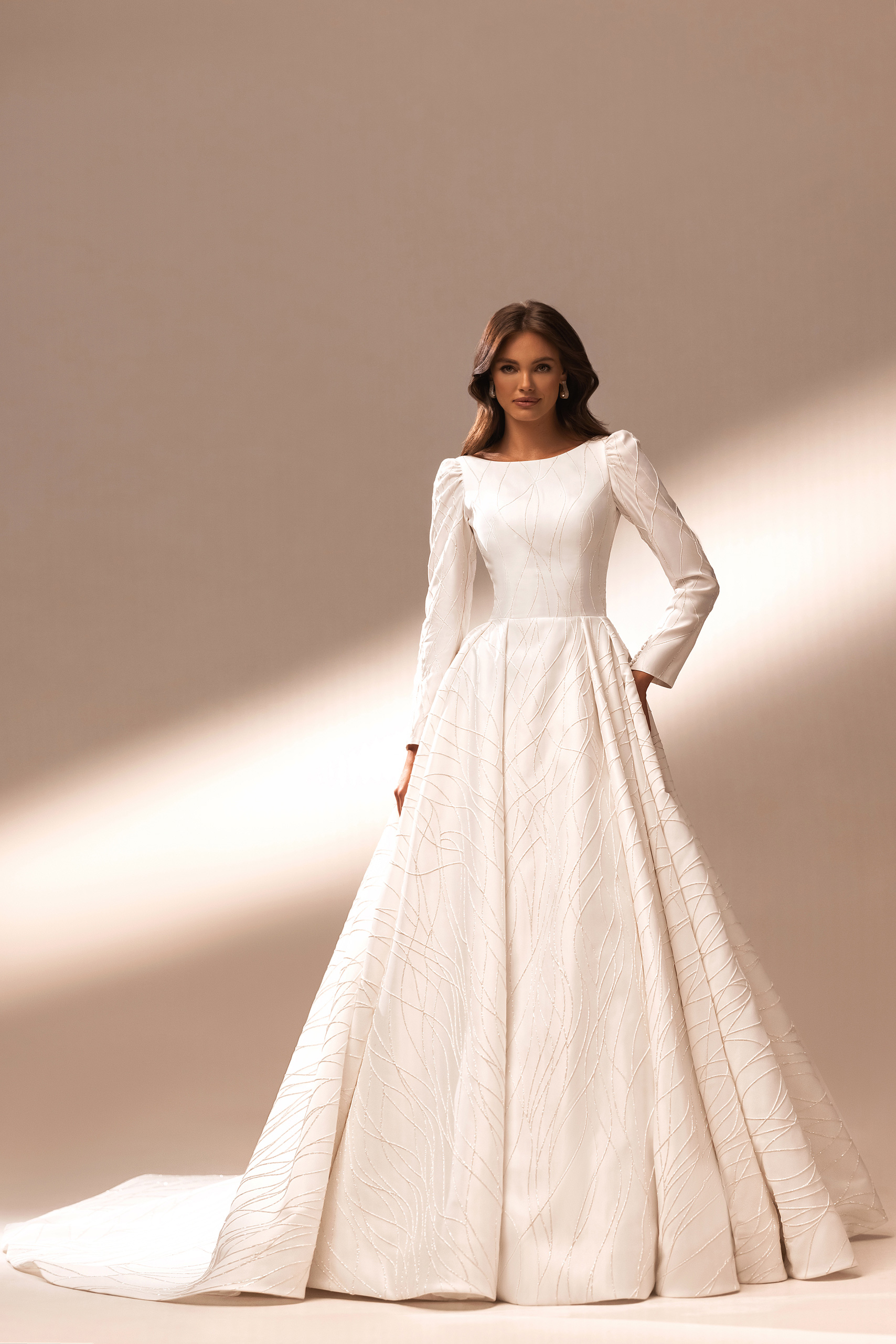 An elegant Sky dress with boat neckline, long sleeves and up-shoulder, created from stiff satin with glitter patterns. At the back, the dress has an open back, which is complemented by a row of buttons, a bow and a long train. The skirt falls in beautiful folds, in which pockets are hidden.