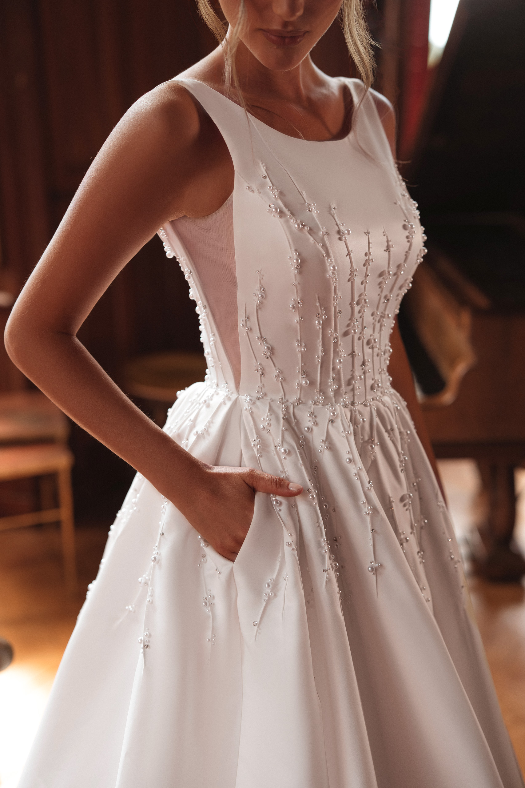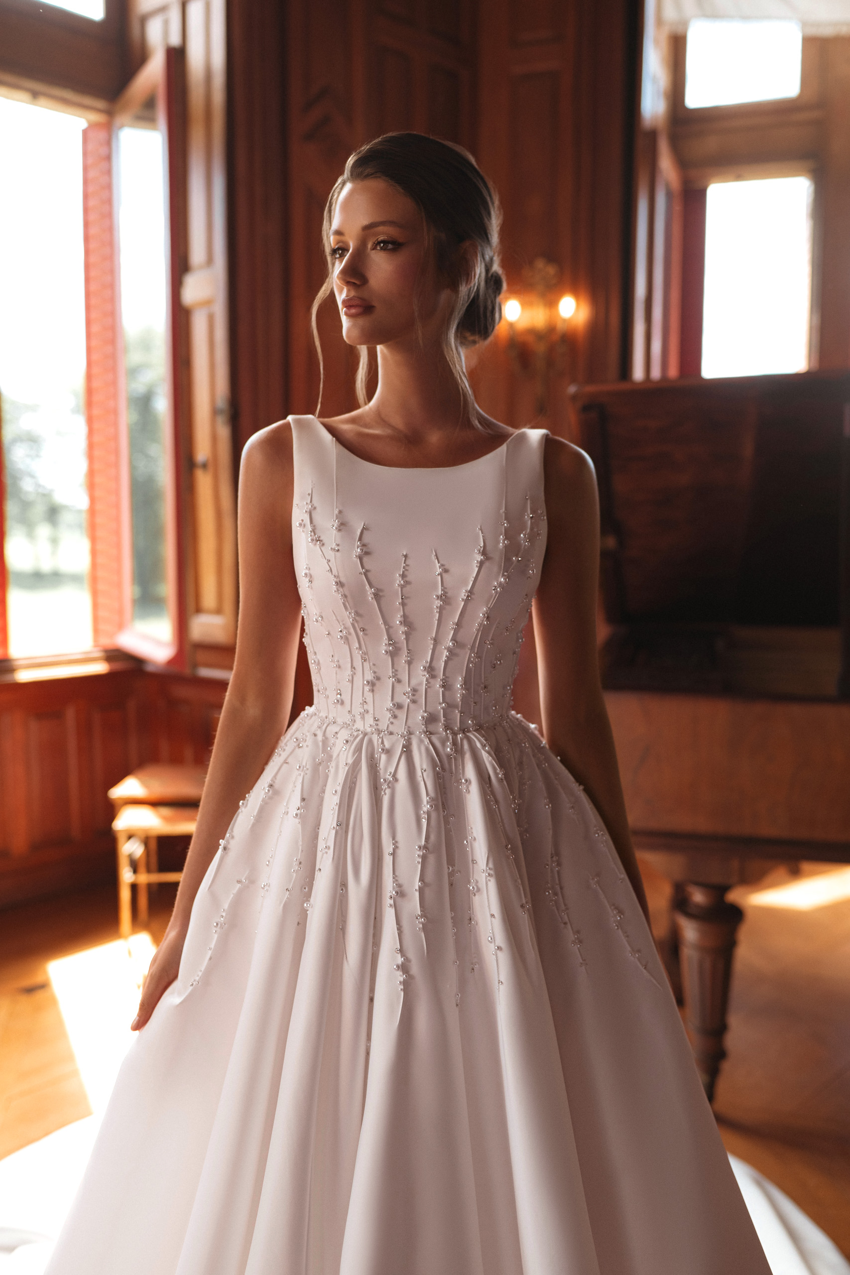 Rochia Zorena îmbină simplitatea nobilă cu detaliile couture care fac diferența. Bustul fin decorat cu broderie subtilă și aplicații verticale creează un efect de alungire și subțiere a siluetei, în timp ce fusta amplă, cu trena diafană, adaugă acel aer de regalitate pe care orice mireasă îl merită.