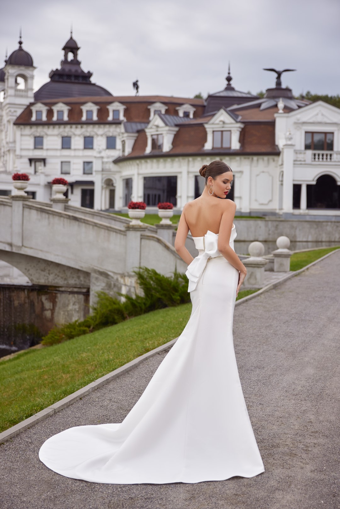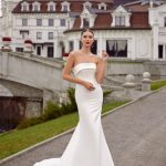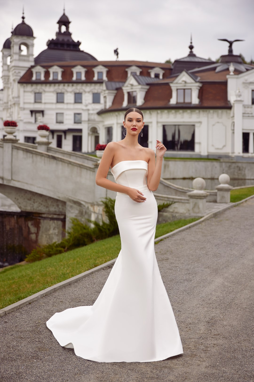 Zoya este o rochie de mireasa extrem de romantica din crep-satin lucios. Forma clasica de sirena ajuta la evidentierea siluetei.